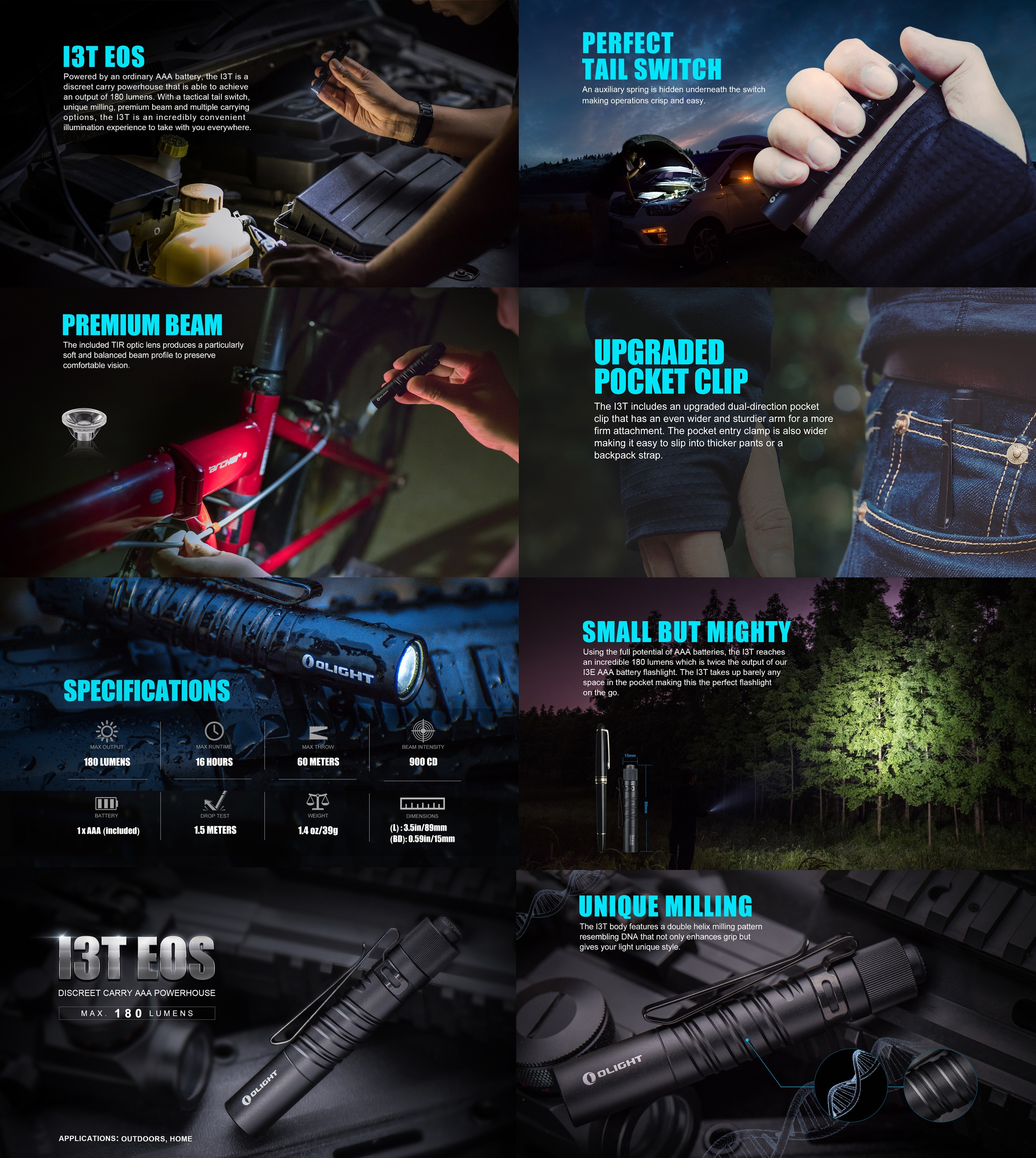 The I3T EOS is a slim tail switch flashlight powered by a single AAA battery with a max output of 180 lumens. It is equipped with an excellent LED paired with a TIR optic lens producing a soft and balanced beam. It is also equipped with a dual direction pocket clip for multiple carrying options such as a pocket or backpack strap. The I3T is an incredibly convenient illumination experience to take with you everywhere.