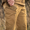 The pants feature multiple practical pockets: side pockets for a knife or magazine, cargo pockets with hidden volume that do not visually enlarge the silhouette, and front pockets with quick access. The back area is reinforced for extra protection against wear and tear when walking and sitting. The fabric is dirt-resistant, and the cut ensures complete freedom of movement.