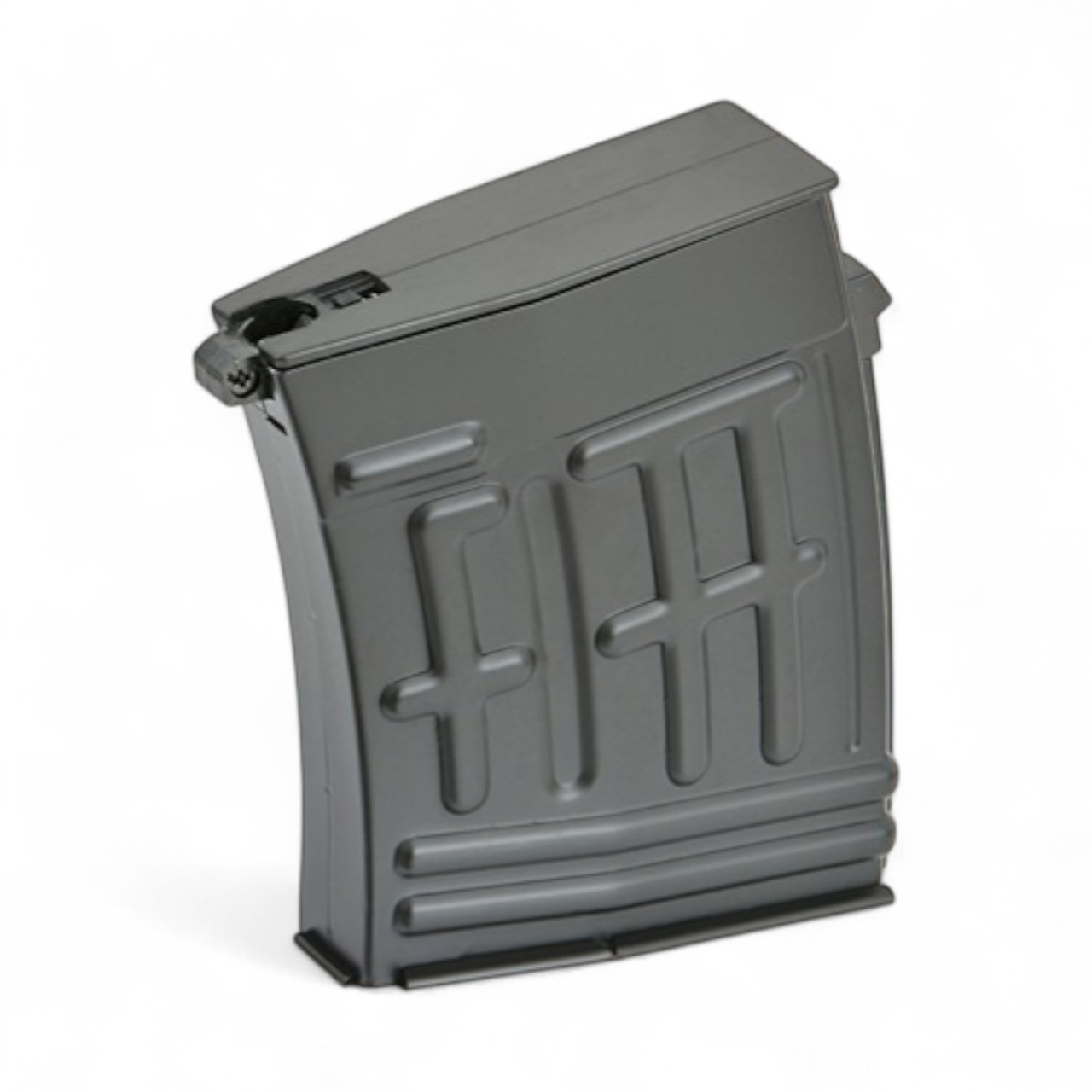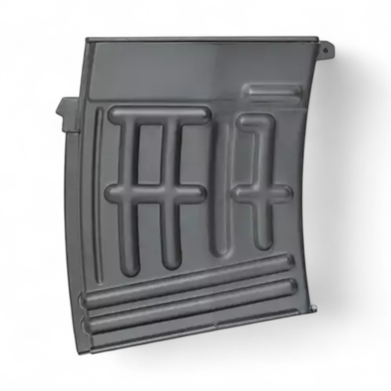 Mid-cap magazine with a capacity of 80 BBs, compatible with manually operated (spring-powered) SVD airsoft replicas, such as models from S&T, KOER and AGM. Manufactured by Snow Wolf, this magazine combines a solid steel casing with polymer internal components, ensuring durability and consistent feeding during gameplay. Not compatible with AEG SVD replicas.