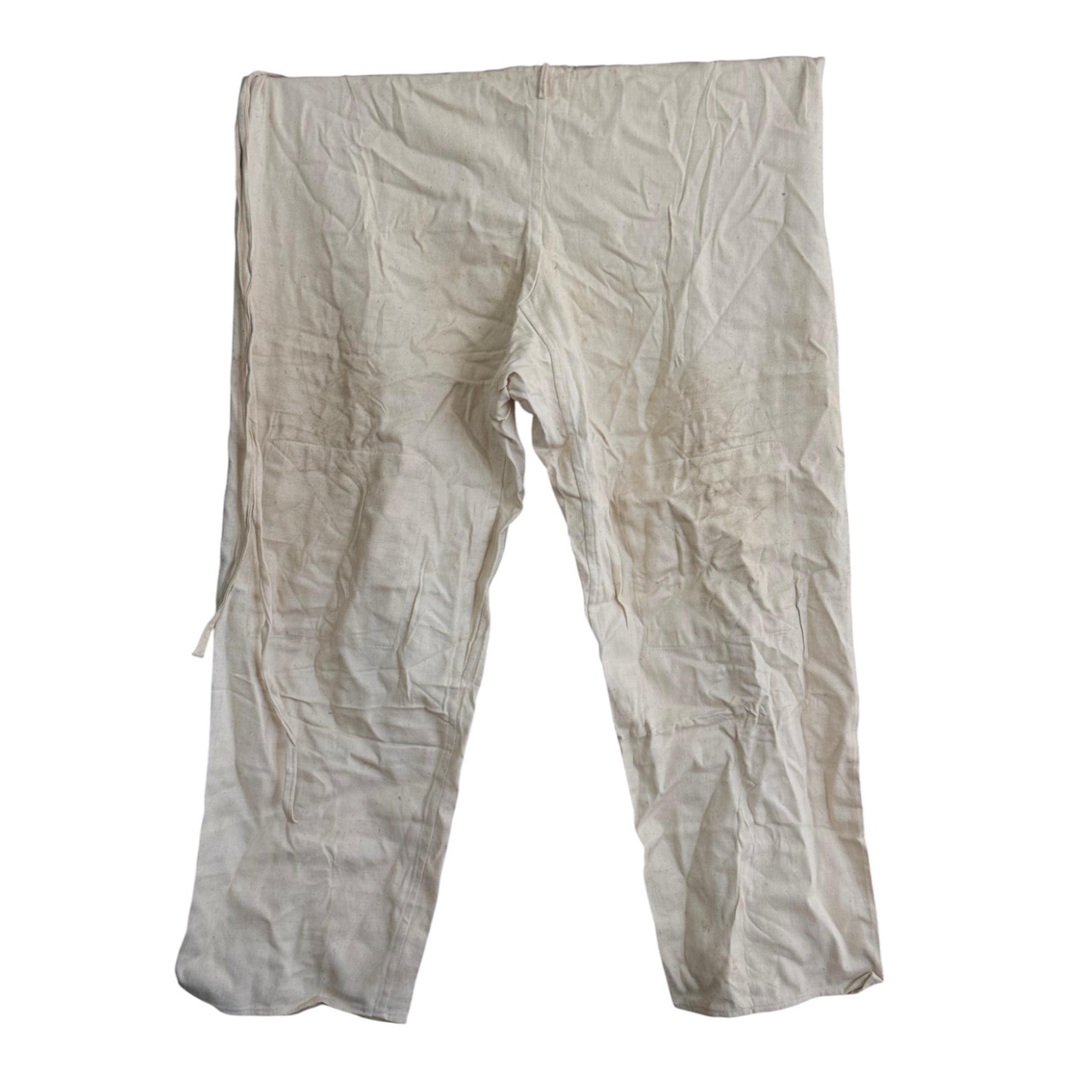Simple pants with drawstring closure, no obvious reinforcements at the knees.