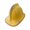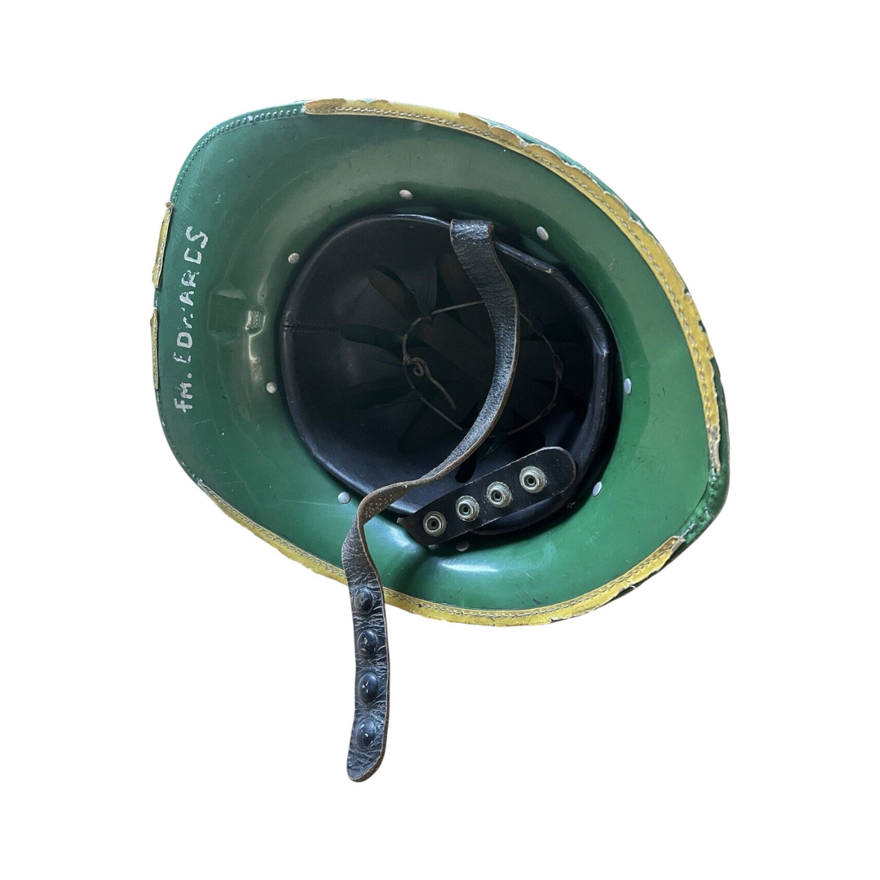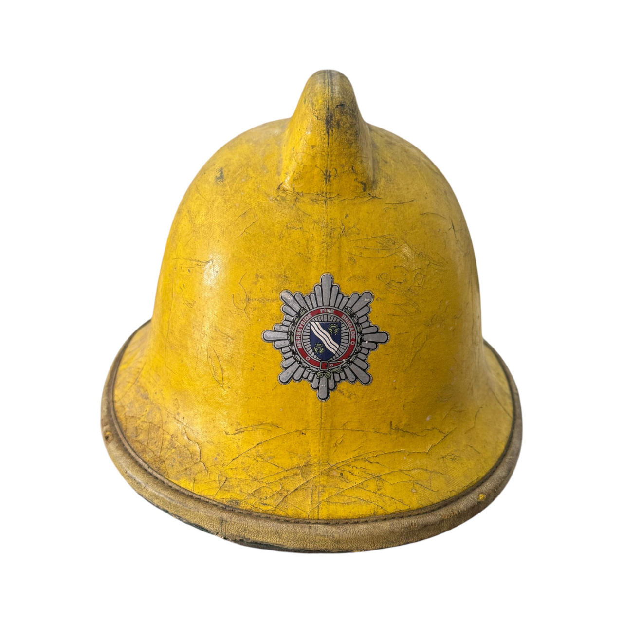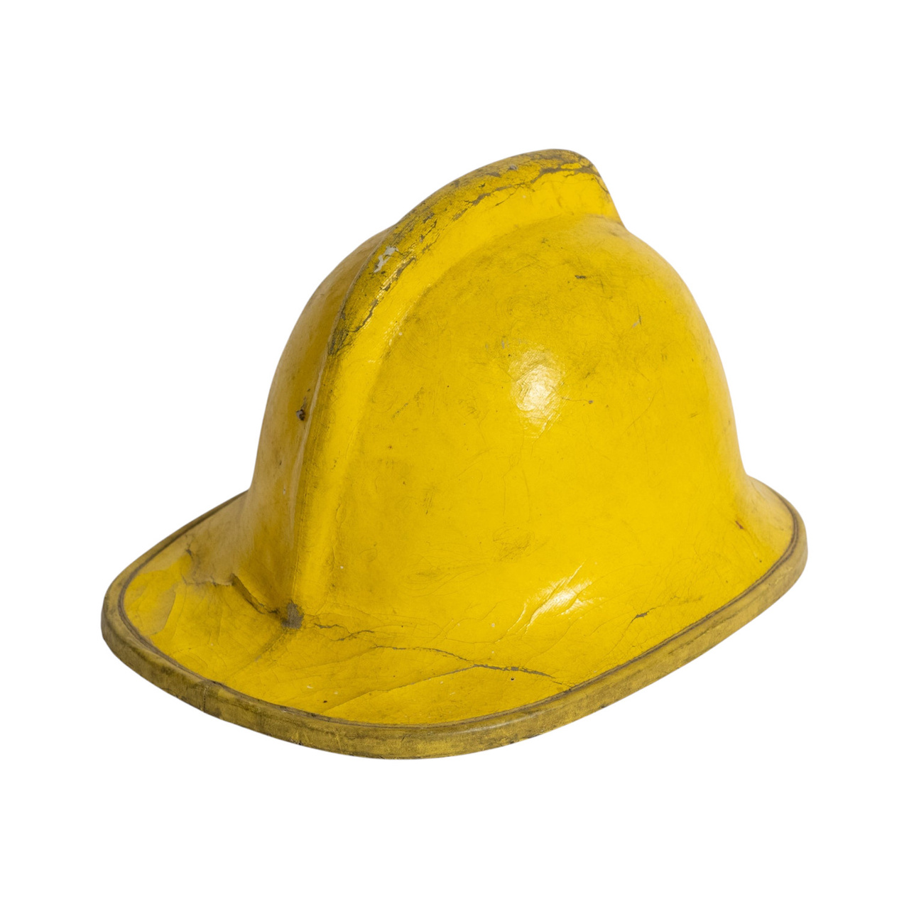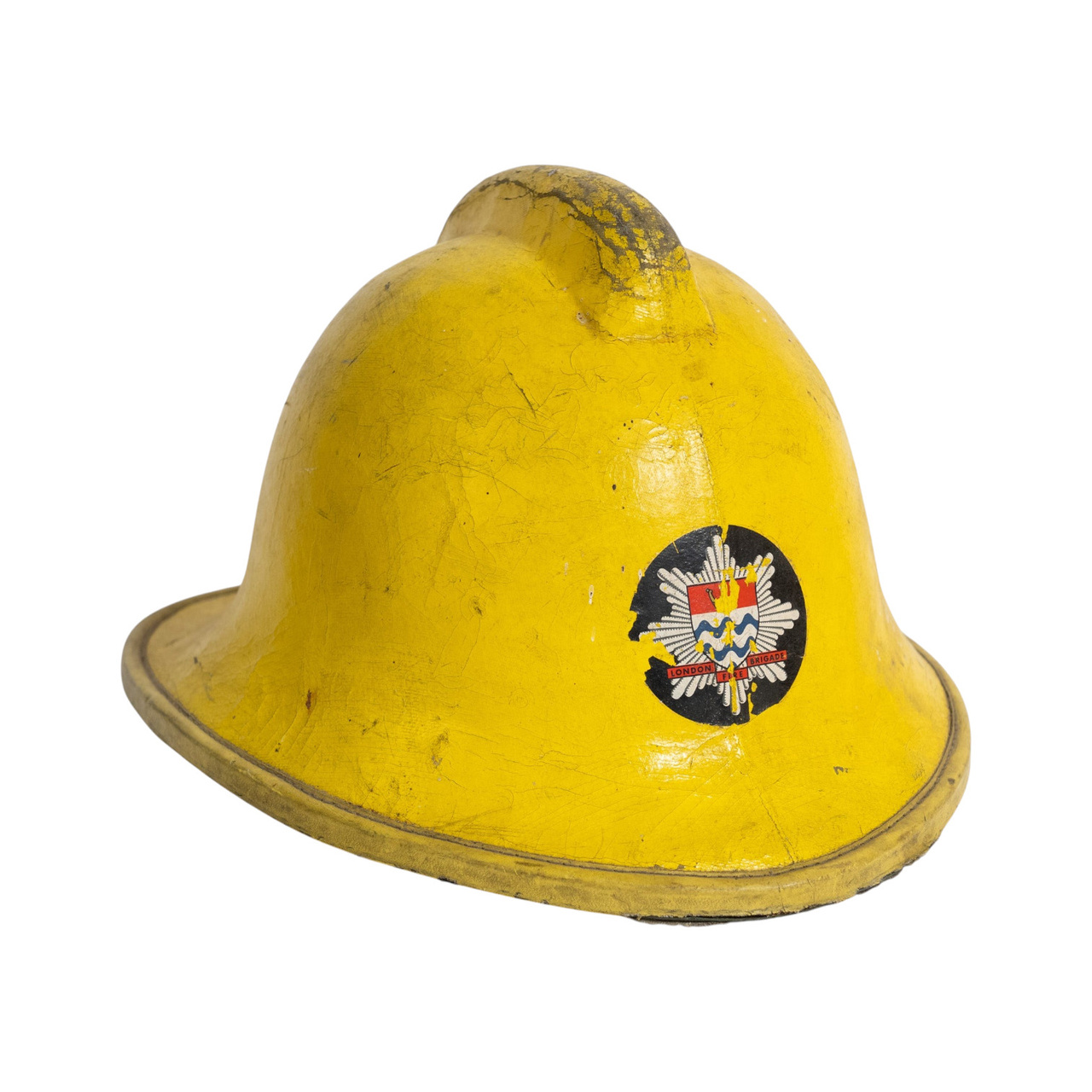 This yellow Cromwell County Pattern helmet was introduced in 1974 to replace the black cork helmets, offering better visibility and a modern design for that period. It is a collector's item appreciated by enthusiasts of firefighting equipment and the history of the London Fire Brigade.