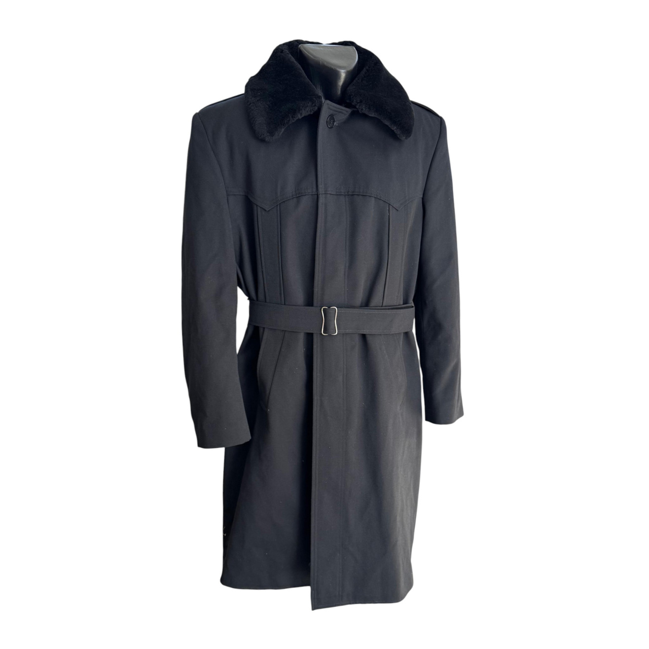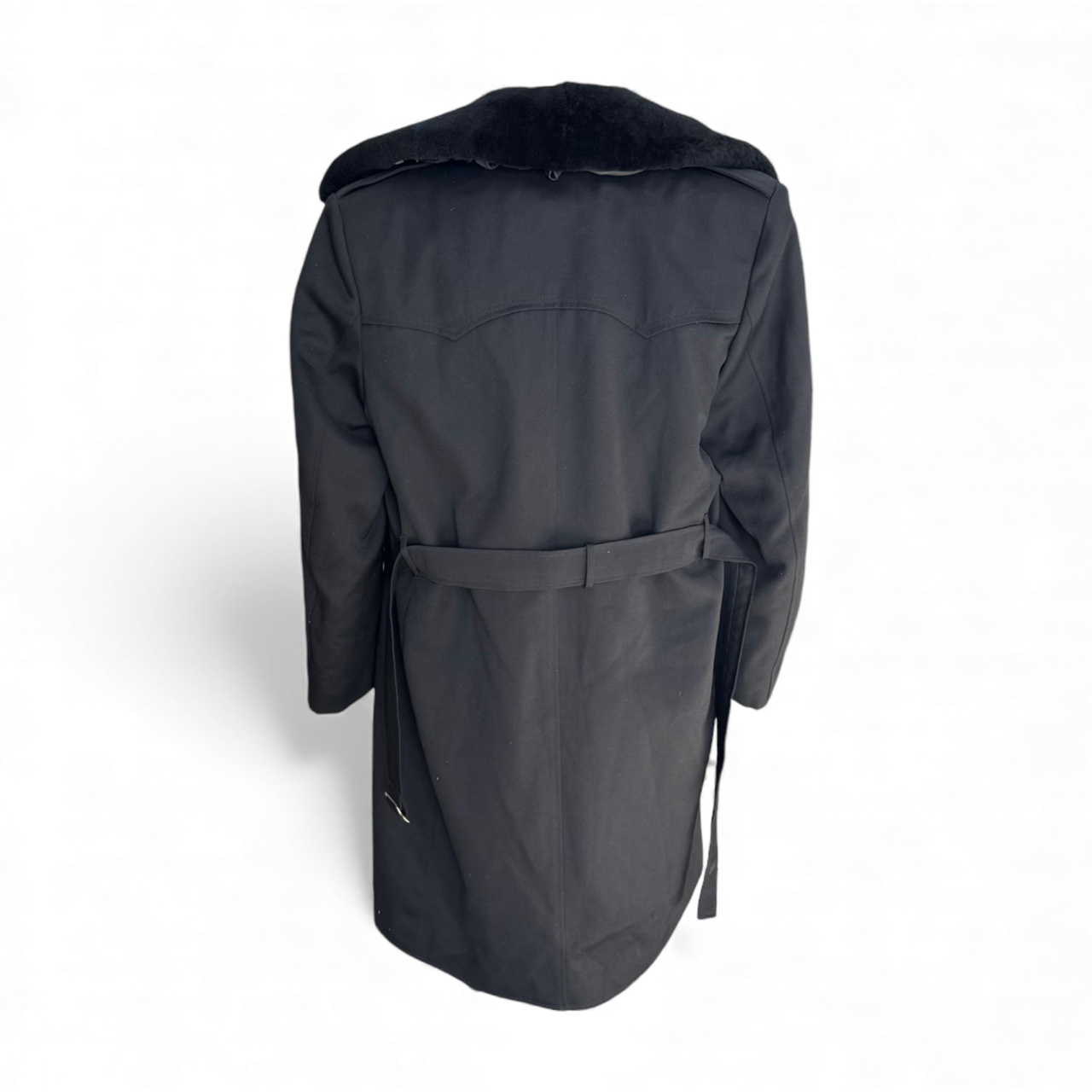 This is a long military coat designed for Bulgarian officers between '75 and '85. The coat features a double lining and can be worn in summer and winter. The winter lining and collar are removable. Made from natural lambskin leather, the lining provides excellent insulation against cold winter weather. The coat has outer and inner pockets, and the buttons are concealed. Epaulettes can be attached to the shoulders.