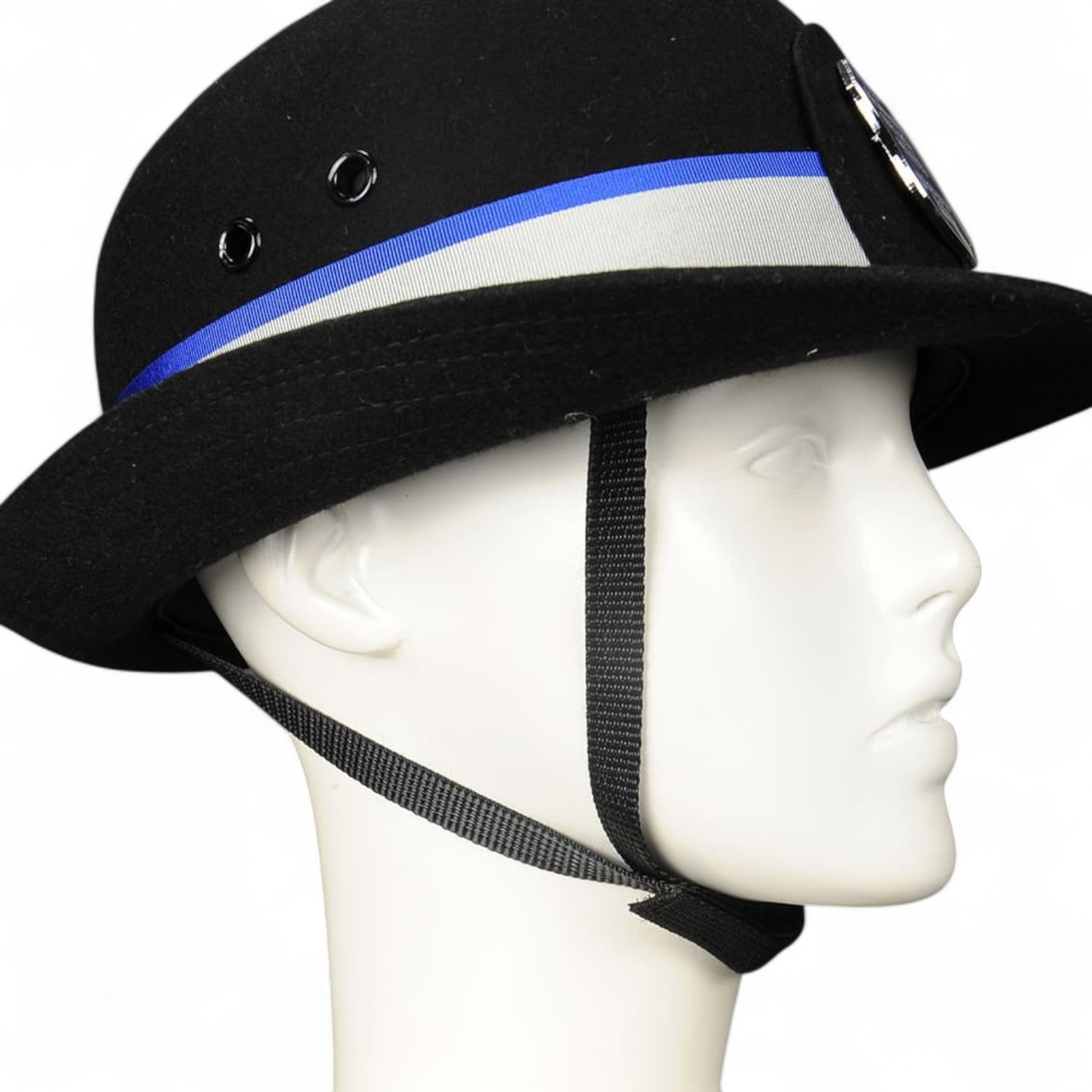 The attached badge reads “COMMUNITY SUPPORT OFFICER”. The helmet is made from a plastic shell with felt material attached, providing a refined finish typical of British uniforms.