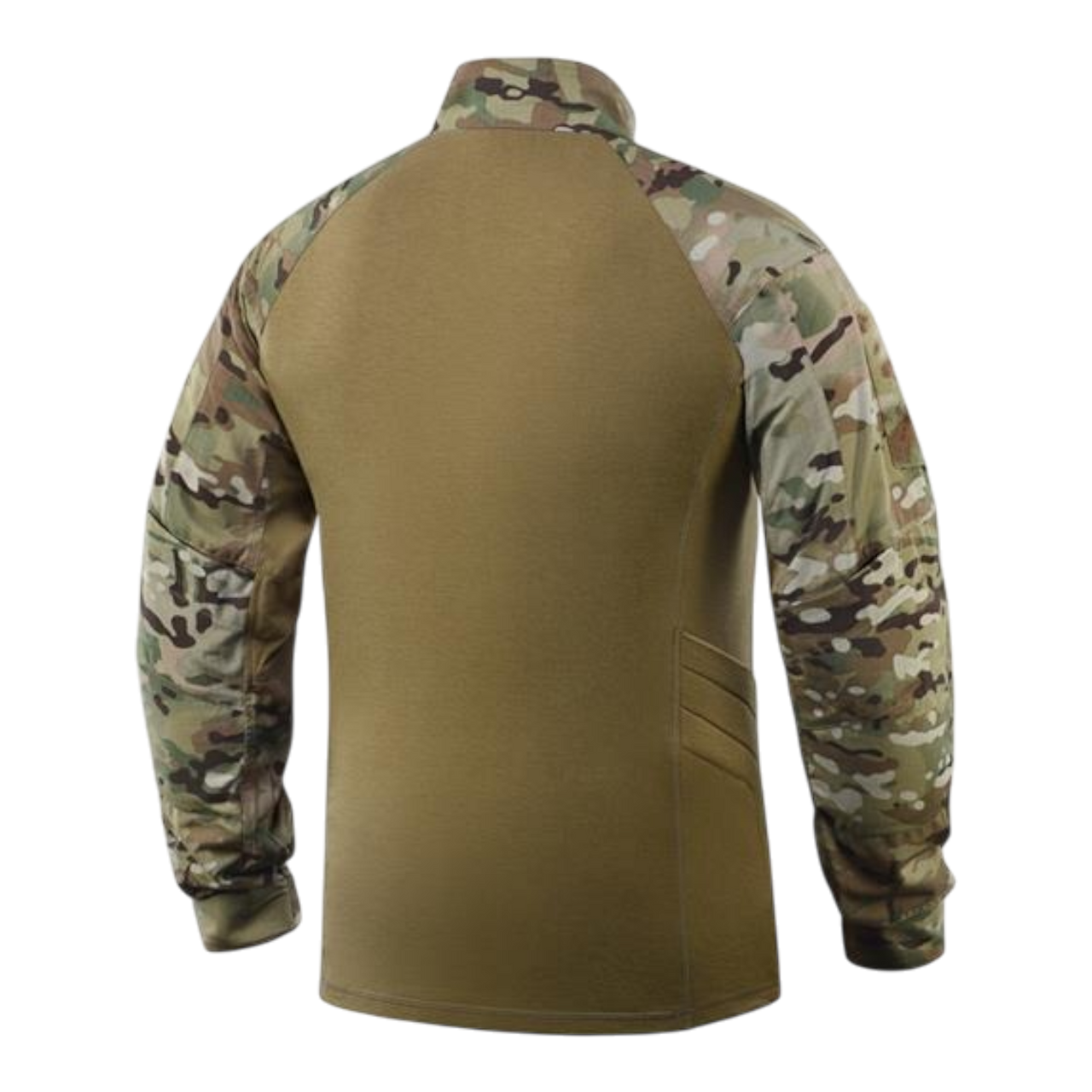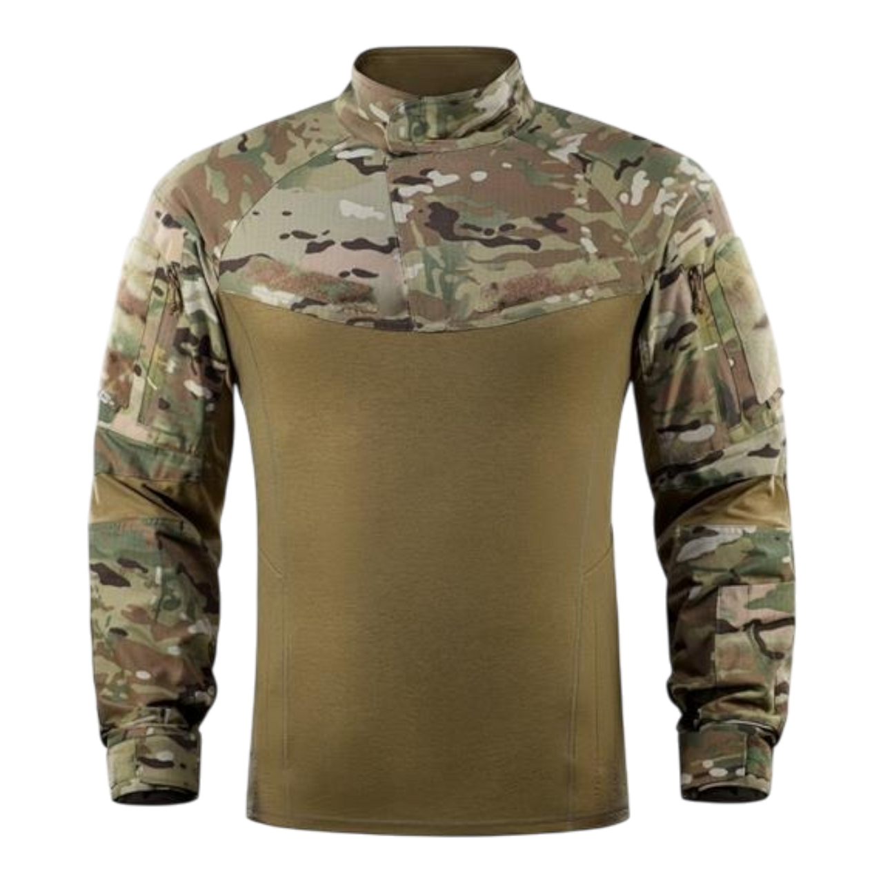 The sleeves and collar are constructed from NYCO Extreme by Brookwood (nylon and cotton blend), a robust material used in U.S. Army uniforms, valued for its high durability, abrasion resistance, and excellent ventilation.