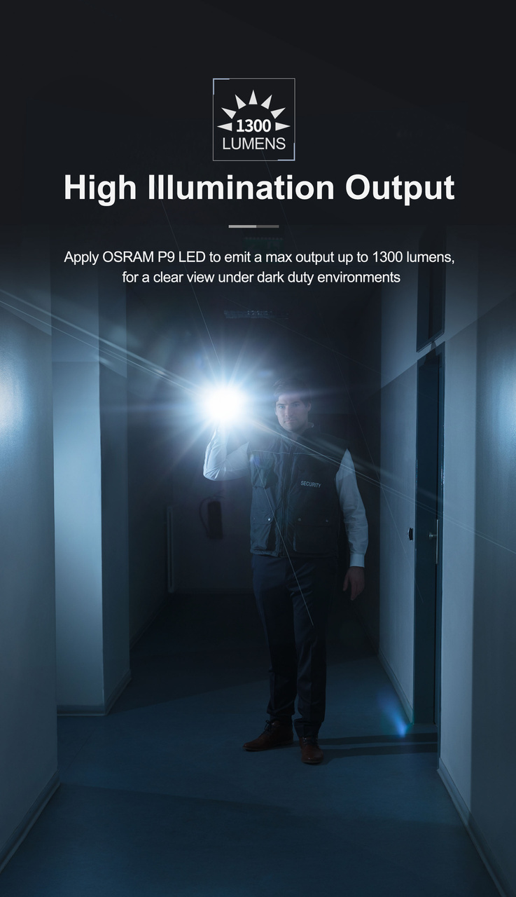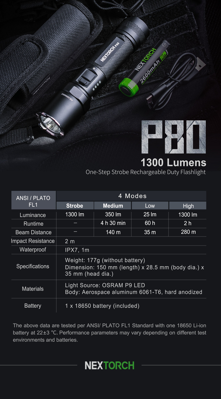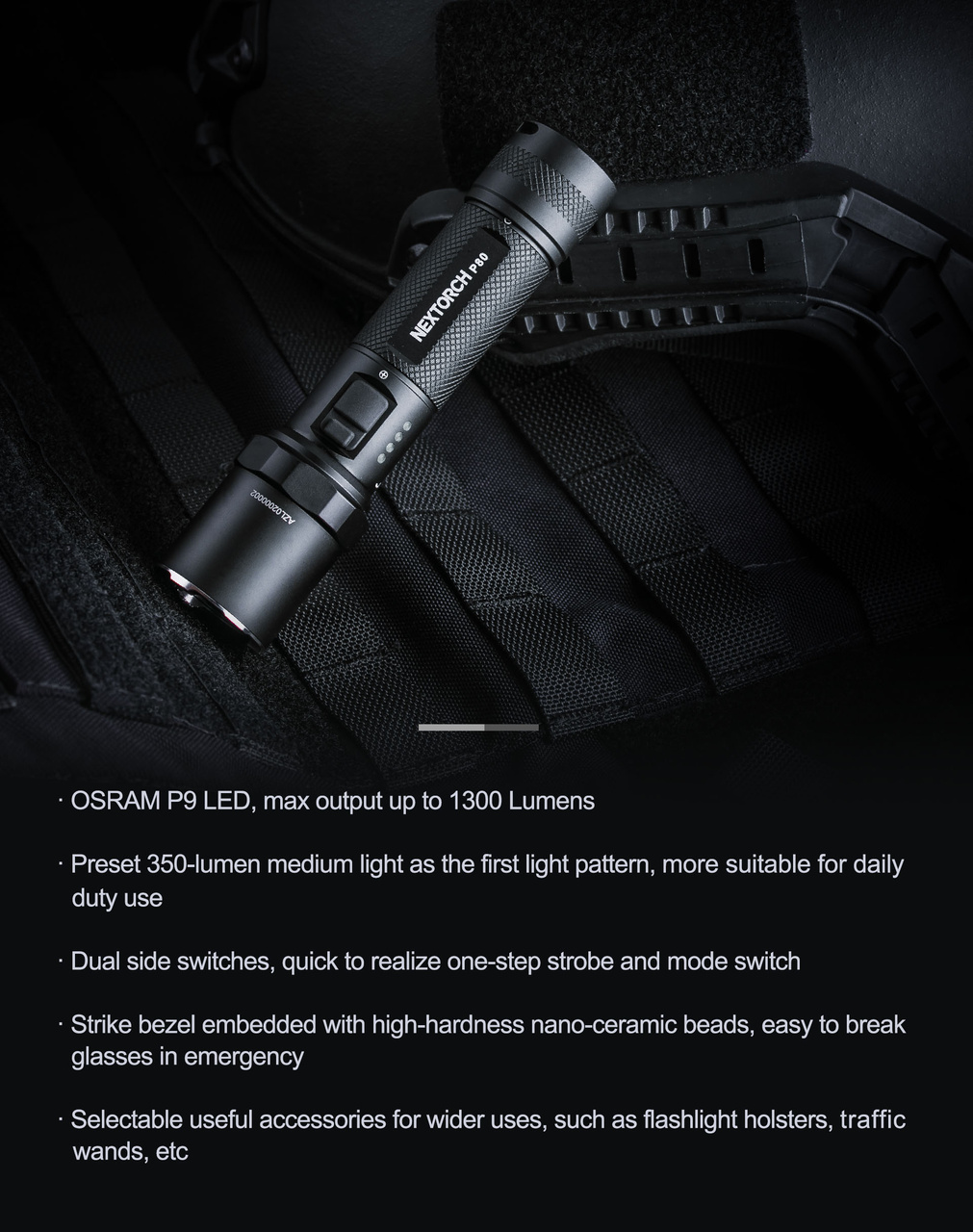 The Nextorch P80 is a powerful tactical flashlight designed for professional use, making it ideal for law enforcement, security personnel, and demanding users. Equipped with a high-performance OSRAM P9 LED, it delivers up to 1300 lumens and features a tactical strobe mode for critical situations.