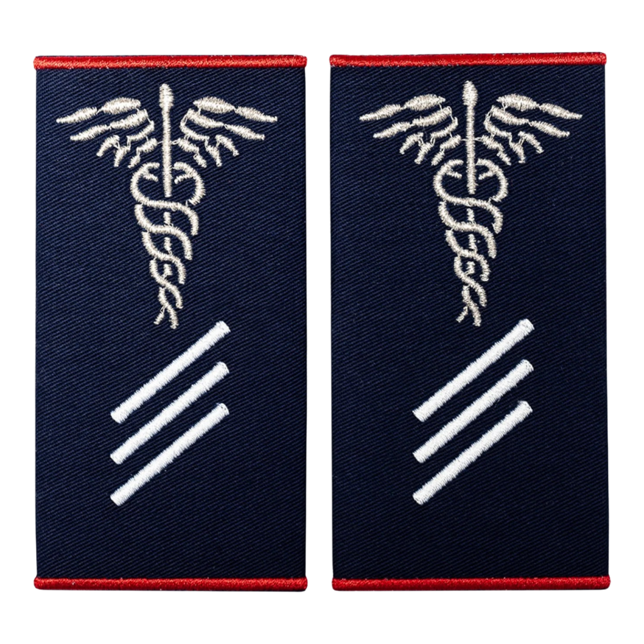 Grade Paramedic Debutant ambulanță tip manșon, tubulare, brodate cu fir Madeira Polyneon, 100% poliester, de culoare roșie și metalică argintie. Conturul exterior este roșu. Întreaga broderie este aplicată pe un material de suport cu întăritură termocolantă din țesătură 65/35% bumbac/poliester. Culoarea suportului este navy și realizează un contrast perfect cu firele folosite la broderie. Datorită utilizării materialelor de cea mai înaltă calitate, gradele pot fi utilizate în exterior, fiind extrem de rezistente la vânt, ploaie, raze solare, precum și la spălări multiple.
