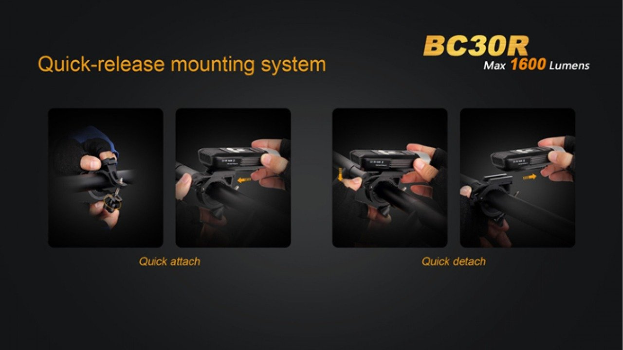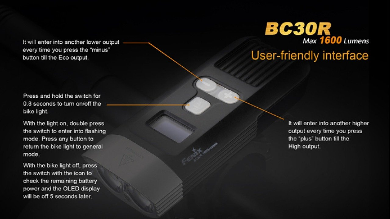 Lanterna REINCARCABILA USB pentru Bicicleta model Fenix BC30R foloseste tehnologia "display digital OLED" pentru a creste siguranta si confortul conferit de cunoasterea exacta si permanena a puterii ramase in baterie. Designul compact, acumulatorul reincarcabil dedicat "built-in", comutatorul inovator si inca foarte multe alte tehnologii inglobate in aceast model versatil, va vor lumina strazila, sau cararile cu o putere de pana la 1600 lumeni si o autonomie de peste 20 de ore !