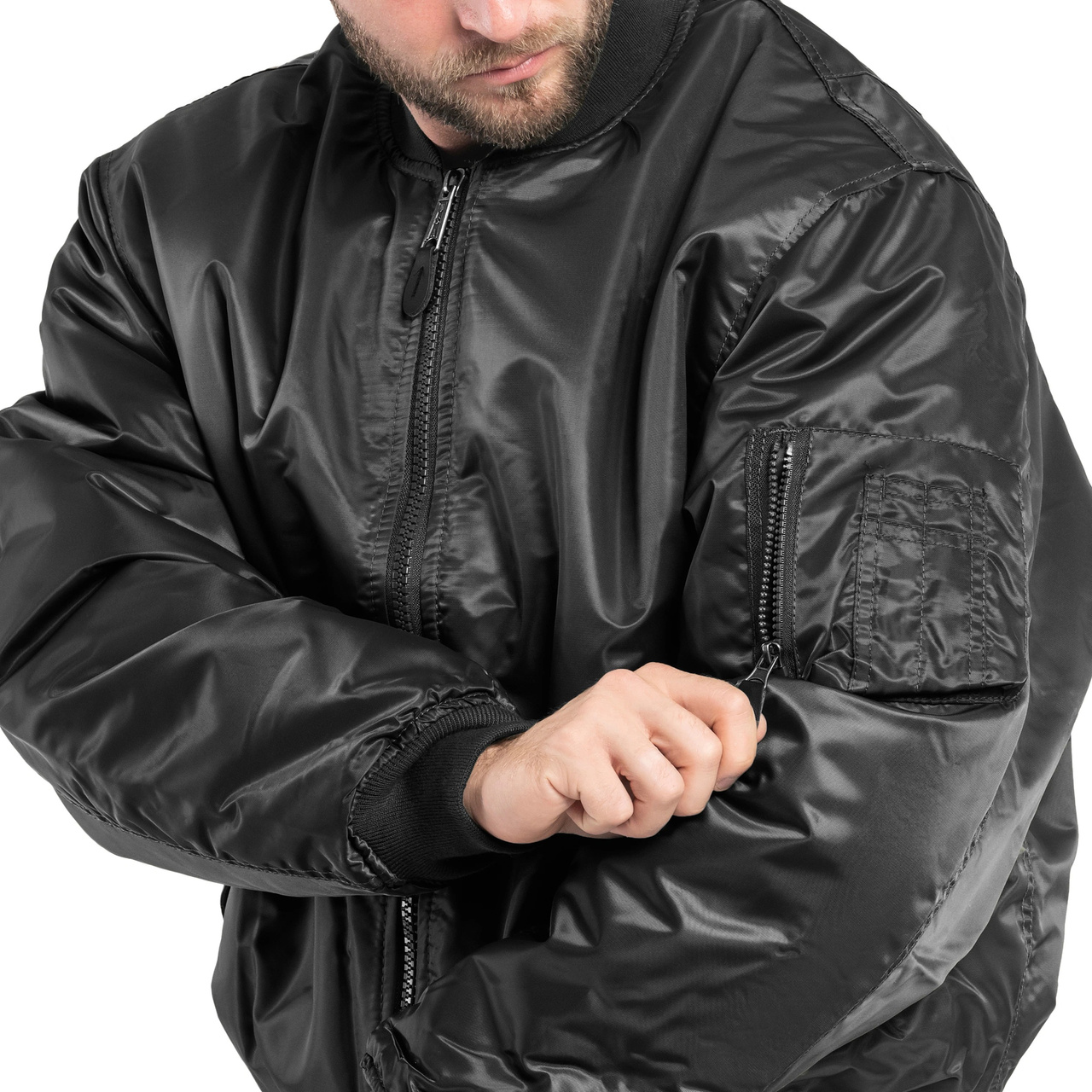 Geaca US MA1 Mil-Tec. Prezinta doua buzunare frontale cu clapa, doua in interior si un buzunar pe umarul stang. Inchiderea se face cu un fermoar iar in talie si la maneci materialul este elastic.