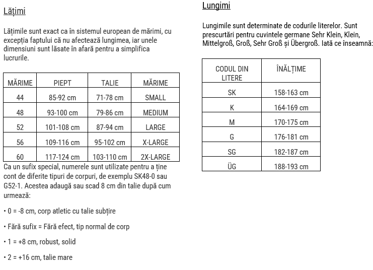 În ceea ce privește lățimea și înălțimea: este ușor să le confunzi, așa că liniștește-te! Dacă sunteți mai înalt sau aveti o constitutie mai mare decât cele obisnuite, aveți nevoie de o dimensiune mai mare. Dimensiunile devin mai mari în ambele masuri. Acest lucru înseamnă că, dacă aveți înălțimea de 190 cm și talie subtire, vi s-ar potrivi pantalonii cu dimensiunea 50, insa pantalonii vor fi scurti. Daca aveti talie mare, dar sunteți scund, s-ar putea să aveți nevoie de un sacou de mărime 56, dar mânecile să fie lungi.