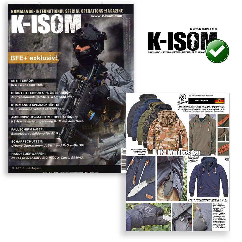 Jacheta de tranziție Windbreaker, fabricată de marca germană Brandit. Jacheta este realizată dintr-un material ușor și respirabil, care rezistă bine la ploaie și la vânt. De aceea este potrivită pentru vremea ploioasă. Jacheta este căptușită cu material din fleece și se potrivește pentru vremea mai rece (primăvară-toamnă și iernile mai blânde). Gluga este de asemenea căptușită cu fleece și poate fi strânsă cu ajutorul șnurului. La gât se află un fermoar ascuns care poate fi deschis până la jumătatea pieptului. Pe partea din față sunt două buzunare laterale cu fermoar. Avantajul jachetei Windbreaker este fermoarul lateral, care este cusut de la subraț până în partea de jos a jachetei, această soluție permite o îmbrăcare și dezbrăcare ușoară. Partea de jos a jachetei poate fi strânsă cu un șnur și astfel nu va permite pierderea căldurii. JachetaLuke Windbreaker este potrivită pentru uzura zilnică, pentru natură, drumeții și alte activități.
