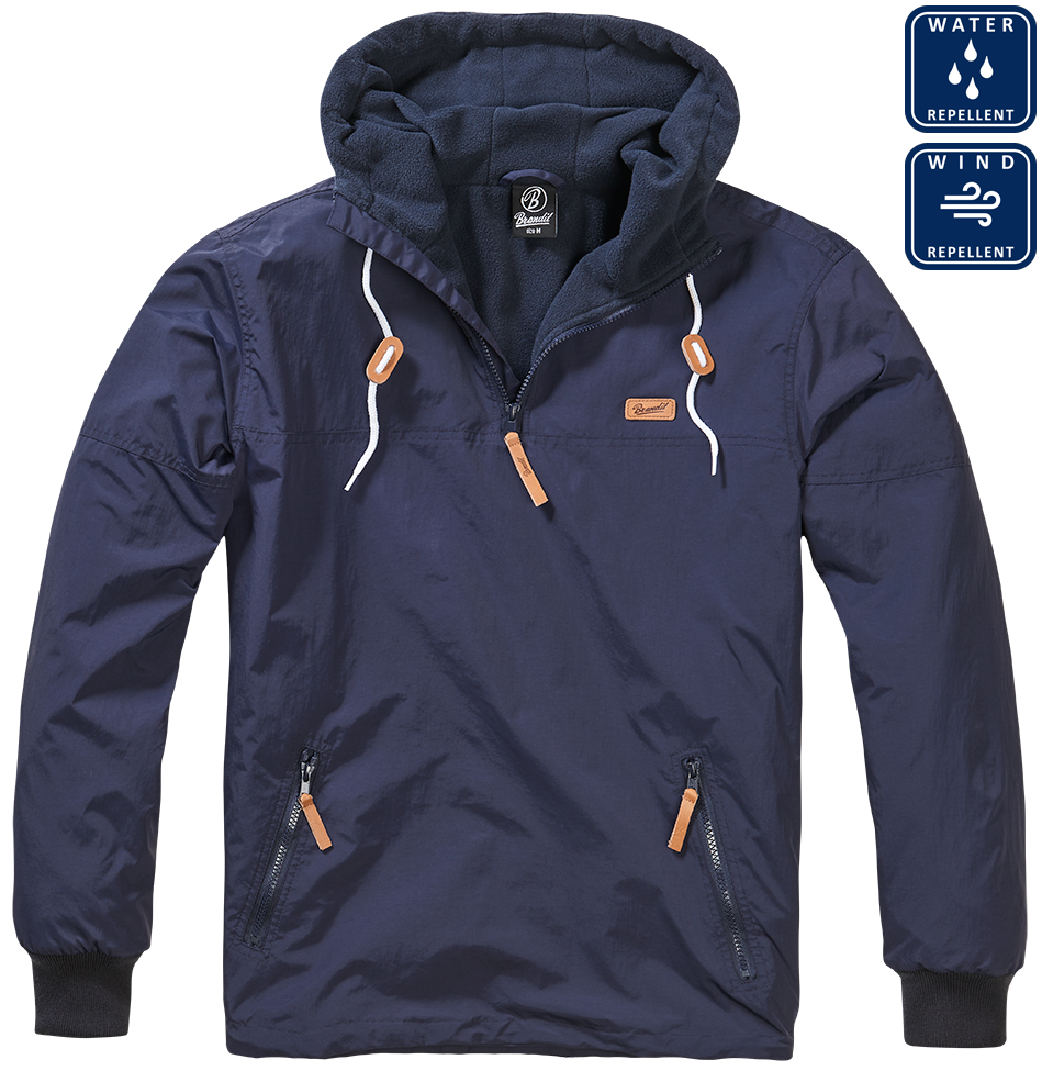 Jacheta de tranziție Windbreaker, fabricată de marca germană Brandit. Jacheta este realizată dintr-un material ușor și respirabil, care rezistă bine la ploaie și la vânt. De aceea este potrivită pentru vremea ploioasă. Jacheta este căptușită cu material din fleece și se potrivește pentru vremea mai rece (primăvară-toamnă și iernile mai blânde). Gluga este de asemenea căptușită cu fleece și poate fi strânsă cu ajutorul șnurului. La gât se află un fermoar ascuns care poate fi deschis până la jumătatea pieptului. Pe partea din față sunt două buzunare laterale cu fermoar. Avantajul jachetei Windbreaker este fermoarul lateral, care este cusut de la subraț până în partea de jos a jachetei, această soluție permite o îmbrăcare și dezbrăcare ușoară. Partea de jos a jachetei poate fi strânsă cu un șnur și astfel nu va permite pierderea căldurii. JachetaLuke Windbreaker este potrivită pentru uzura zilnică, pentru natură, drumeții și alte activități.