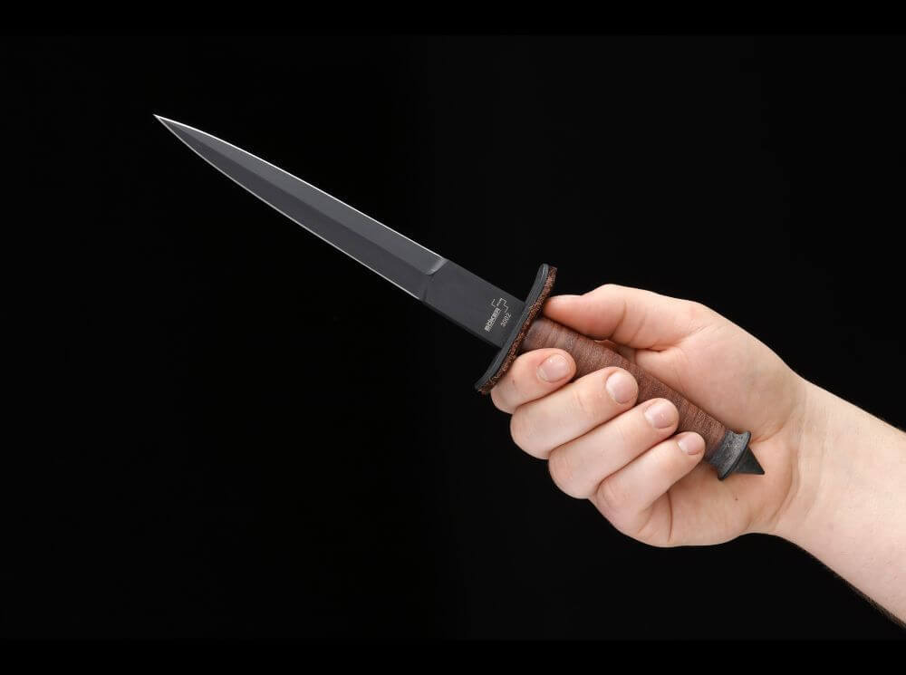 O piesă importantă din echipamentul Brigăzii Diavolilor a fost cuțitul de luptă V-42 special conceput, care făcea parte și din antrenamentul intensiv de luptă corp la corp. Mânerul din discuri de piele comprimată se termină cu un vârf ascuțit de impact. O tapițerie groasă din piele sub mânerul ușor curbat avea rolul de a preveni rănile. Lama cu două tăișuri din oțel carbon inoxidabil SK-85 este acoperită și prezintă un suport ondulat pentru degetul mare care se sprijină în jurul zonei Ricasso. Până în prezent, blazonul forțelor speciale ale armatei americane împodobește acest pumnal legendar.