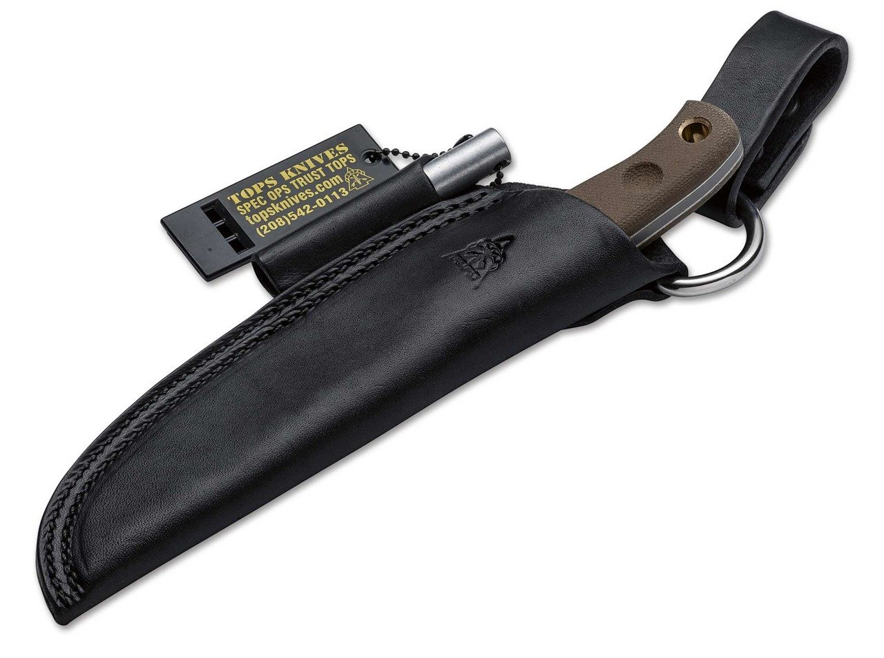 Mânerul din canvas micarta, cu aderență foarte bună, este evidențiat prin spacere din fibră albă, care oferă un accent vizual elegant. Teaca din piele este prevăzută cu o buclă de prindere la curea cu capse, conectată de teaca propriu-zisă printr-un inel mare din oțel, asigurând astfel o mobilitate ridicată în utilizare. De asemenea, teaca include un amnar tip piggyback.