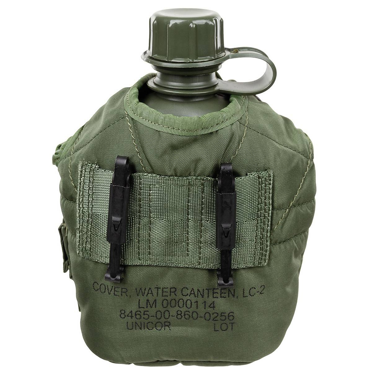 Husă originală militară uzată (folosită) din nailon cu buzunar lateral și două catarame pentru atașarea la curea sau rucsac, de armata SUA. Sticla din plastic este nouă - nefolosită.