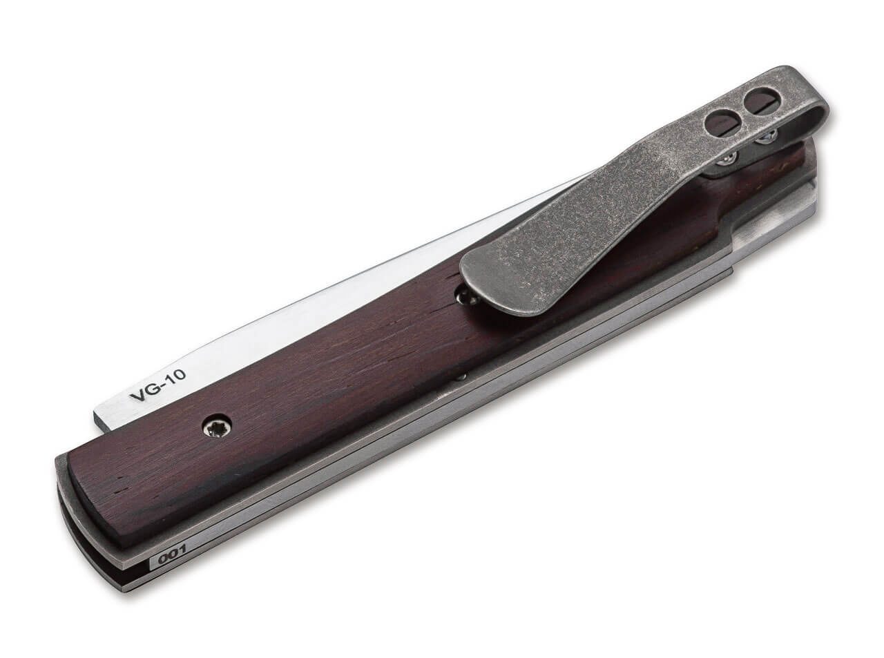 Cea mai mică versiune a Boker Plus Urban Trapper de Brad Zinker este acum disponibilă cu un mecanism de blocare suplimentar, datorită noului sistem de blocare a cuierului brevetat. Datorită cuierului de sârmă care economisește spațiu, nu mai este nevoie de arc suplimentar superior, ceea ce conferă lamei mult mai mult spațiu în mâner. Lama fabricată din VG-10 cu un finisaj fin este echipată pentru operarea cu două mâini. Cântarele cu mâner nobil din lemn de cocobolo selectat subliniază caracterul nobil al acestui cuțit extrem de ușor. Cu clemă de transport profundă (tip-up / r) și carcasă din nailon de înaltă calitate.