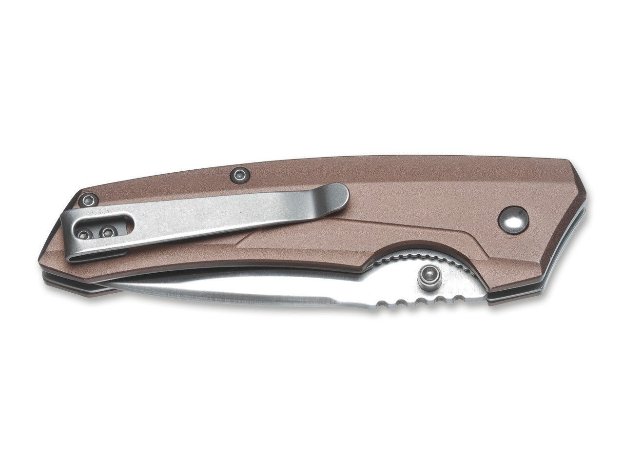 Magnum Seventies Metallic revine la mașinile de neuitat din anii 1970 fabricate de Ford, Oldsmobile și Chevrolet. Acele iahturi lungi, cu motoarele lor cu volum mare și aripioarele uriașe, erau adesea vopsite în tonuri pământii metalice. Acest cuțit de buzunar atrăgător are o lamă de oțel inoxidabil 440A care se deschide cu un vârf de deget. Un linerlock robust și coloana vertebrală crestată sporesc siguranța la lucru Cu un clip repoziționabil (tip-up / tip-down).
