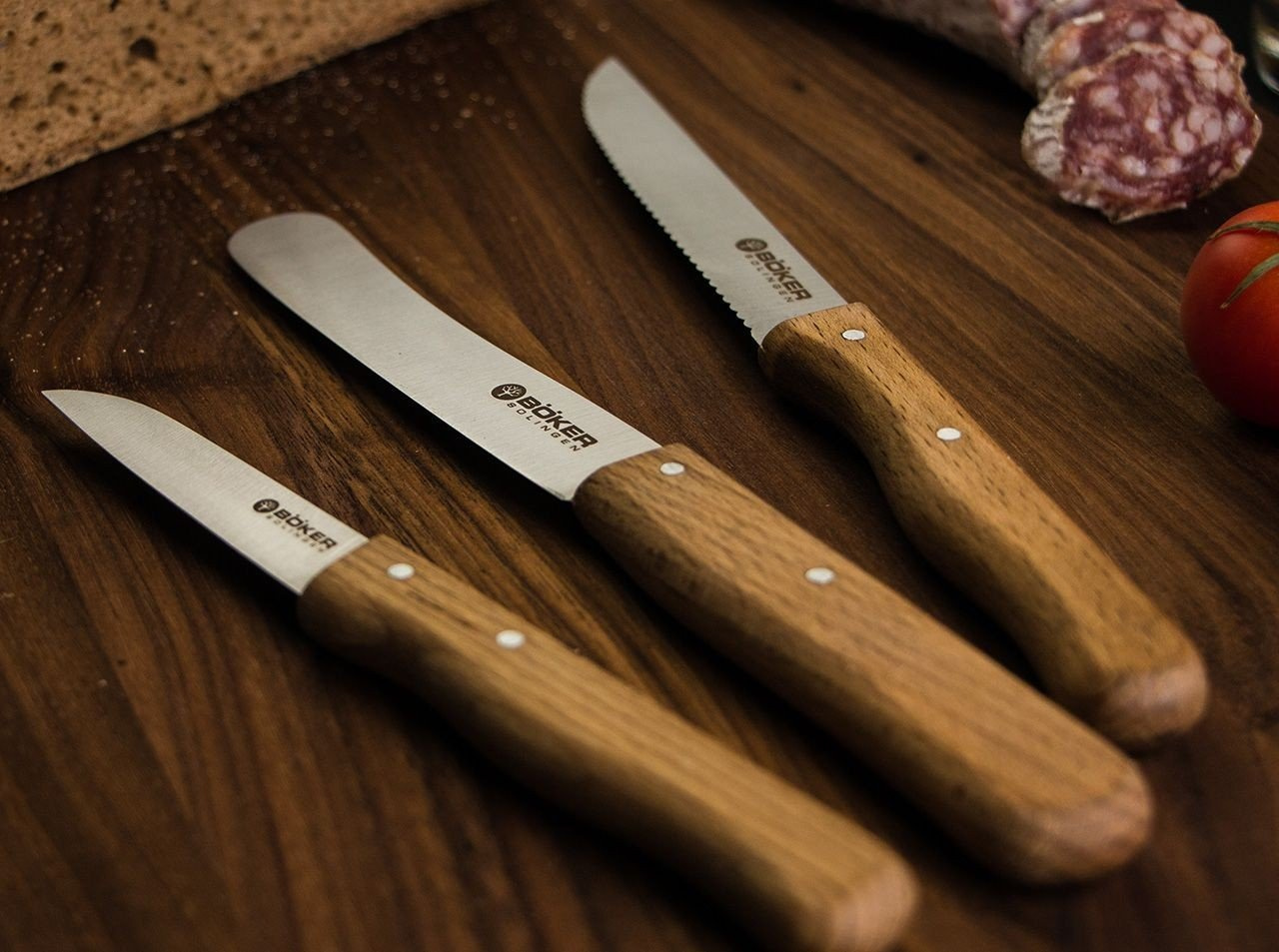 Seria Boker Classic este ideală pentru tăierea și pregătirea mâncării. Fabricate din cel mai fin oțel inoxidabil cu lamă Solingen, lamele în formă tradițională sunt măcinate foarte subțiri pentru un profil foarte fin. O rectificare manuală fină face cuțitele perfect ascuțite. Mânerele sunt realizate din lemn de fag local minunat. Calitate adevărată, fabricat în Solingen, Germania.