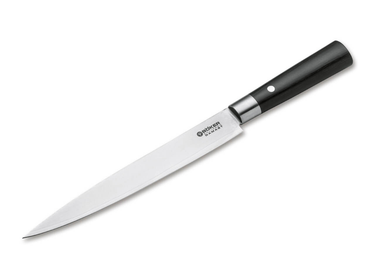Linia de cuțite de bucătărie negru Boker Damascus combină mânere tradițional japoneze din placaj negru cu lame ascuțite ca un brici din Damasc inoxidabil cu 37 de straturi de oțel, caracterizate printr-un bob frumos. Miezul cu impact extrem de ridicat al lamei Damasc este format din oțel VG-10 de înaltă performanță. Claritatea vizibilă la tăiere este uluitoare și face din gătit o experiență. Designul japonez al mânerului cuțitului cu cleme din oțel inoxidabil conferă liniei caracterul său special.