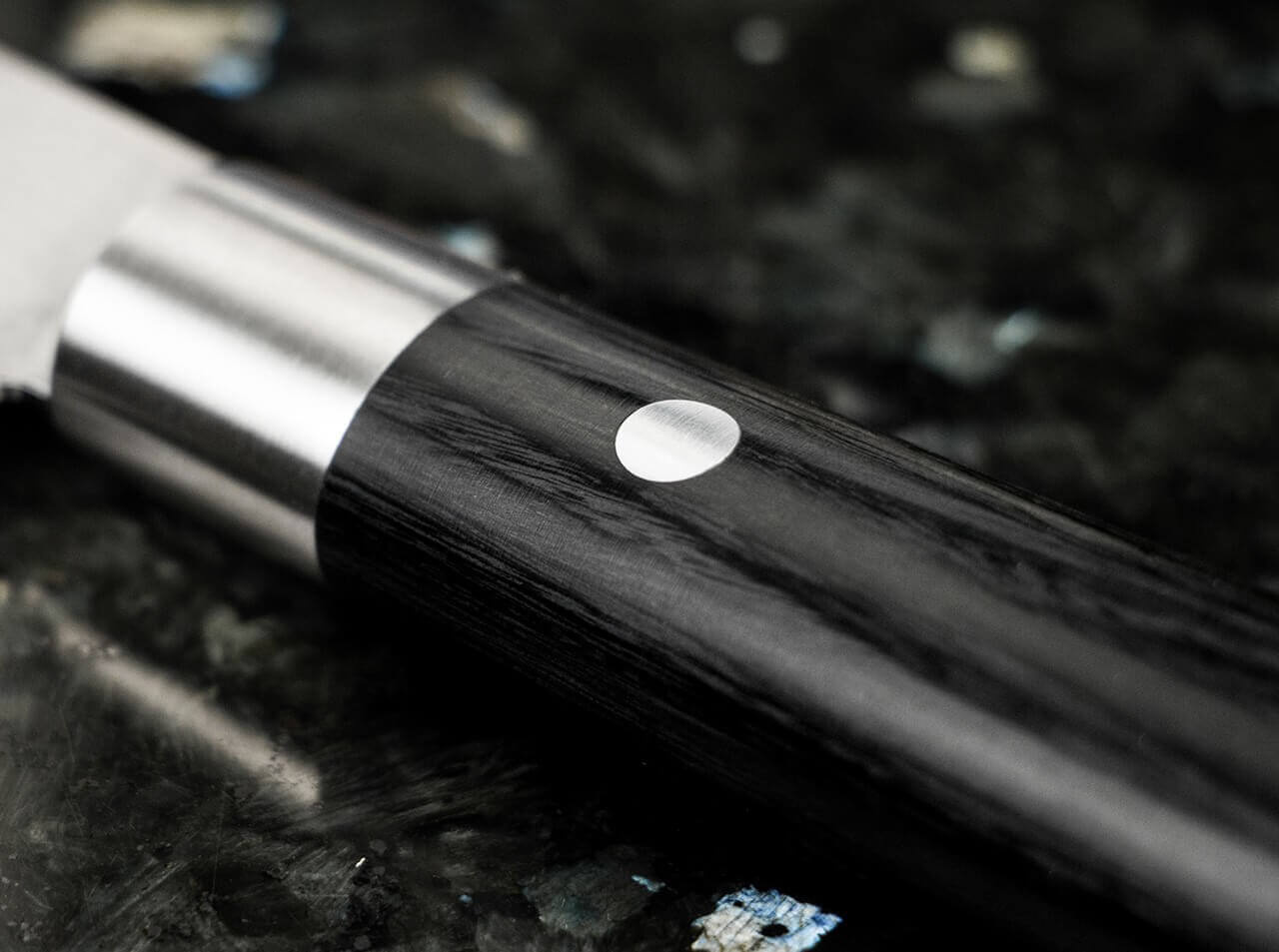 Linia Boker Damascus Black Kitchen Knife combină mânere tradițional japoneze realizate din placaj local negru cu lame ascuțite ca un brici din Damasc inoxidabil cu 37 de straturi de oțel, caracterizate printr-un bob frumos. Miezul cu impact extrem de ridicat al lamei Damasc este format din oțel VG-10 de înaltă performanță. Claritatea vizibilă la tăiere este uluitoare și face din gătit o experiență. Designul japonez al mânerului cuțitului cu cleme din oțel inoxidabil conferă liniei caracterul său special. Bucătarii de top nu sunt singurii care înjură cuțitele de bucătărie japoneze - sunt, de asemenea, populari cu mulți bucătari amatori ambițioși. Avantajele cuțitelor cu mânere japoneze și construcția tradițională a lamei cu împingere și virole din oțel inoxidabil sunt evident evidente, deoarece pot tăia alimentele delicate fără a le zdrobi sau a leza. De exemplu, atunci când tăiați ierburi, tăierea fină nu eliberează uleiurile lor. Așadar, aromele nu se pierd și chiar puteți evita lacrimile atunci când tăiați ceapă. Senzația de claritate în timpul tăierii este uluitoare și face din gătit o adevărată experiență. Secretul acestei clarități neobișnuite constă în material și în prelucrarea acestuia. Lama este formată din 37 de straturi de oțel Damasc. Lama din oțel inoxidabil premium VG-10 utilizat pentru stratul central este fabricată în Japonia și oferă duritate, rezistență și o structură cristalină omogenă. În comparația directă a performanței de gătit cu un produs realizat de un producător de cuțite de bucătărie Solingen stabilit în conformitate cu DIN EN ISO 8442-5, linia de cuțite de bucătărie Boker Damascus Black este literalmente o tăietură de mai sus. Testul DIN reprezentativ a arătat că performanța de tăiere a cuțitelor noastre a fost cu 68% mai bună decât cea a produsului concurentului. Cuțitele obțin, de asemenea, puncte cu un nivel mai ridicat de claritate inițială. Astfel, ascuțirea constantă este un lucru din trecut.