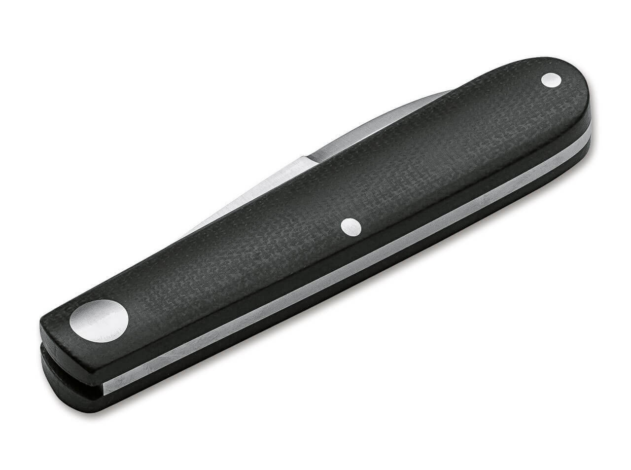 Această versiune construită integral a noului Boker Barlow Prime interpretat nu are suporturile caracteristice și este în schimb echipată cu manere, plăcut conturate, realizate din Canvas Micarta negru. Construcția ușoară poate astfel să renunțe complet la căptușeli metalice suplimentare. Lama finisată din satin este fabricată din N690 întărită cu gheață și este deschisă de unghiul cu cui. Este echipat cu un ricaso modern, alungit, siguranța de funcționare a slipjoint-ului este mărită cu un dispozitiv de oprire de 90 de grade la deschidere și închidere. Niturile decorative sunt fabricate din oțel inoxidabil. Cu carcasă din pâslă de înaltă calitate pentru depozitare. Fabricat manual în fabrica de cuțite Boker din Solingen.
