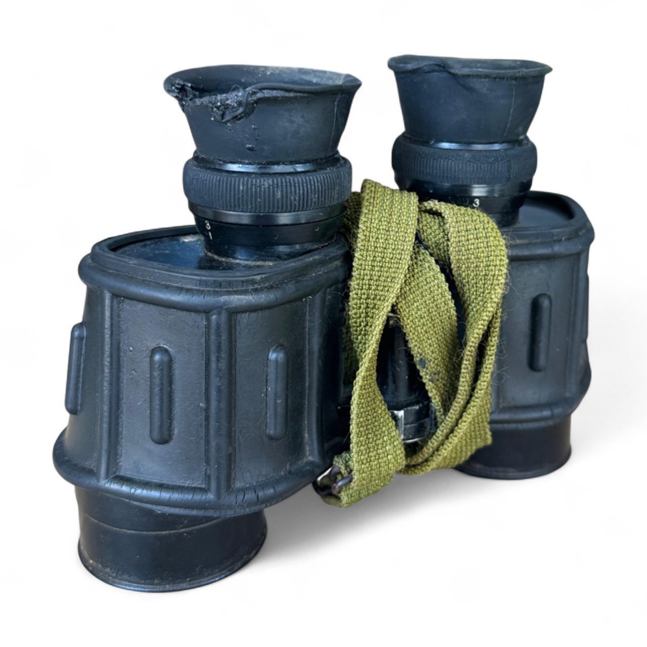 Acest binoclu militar prezintă semne clare de utilizare intensivă, fiind un echipament vechi, dar aparent funcțional. Carcasa exterioară din cauciuc este uzată, cu zone în care vopseaua este sărită sau matifiată, iar unele margini sunt tocite. Pe lentile se observă urme de praf și murdărie, ceea ce poate afecta parțial claritatea imaginii dacă nu este curățat corespunzător.