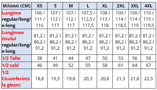 Am dori să ne asigurăm că hainele pe care le achiziționați vi se potrivesc cu adevărat - pentru ca acestea să își îndeplinească scopul în mod corespunzător. Vă rugăm să investiți un moment din timpul dvs. prețios pentru a verifica ghidul de măsuri și tabelul de mărimi corespunzător pentru a evita erorile.