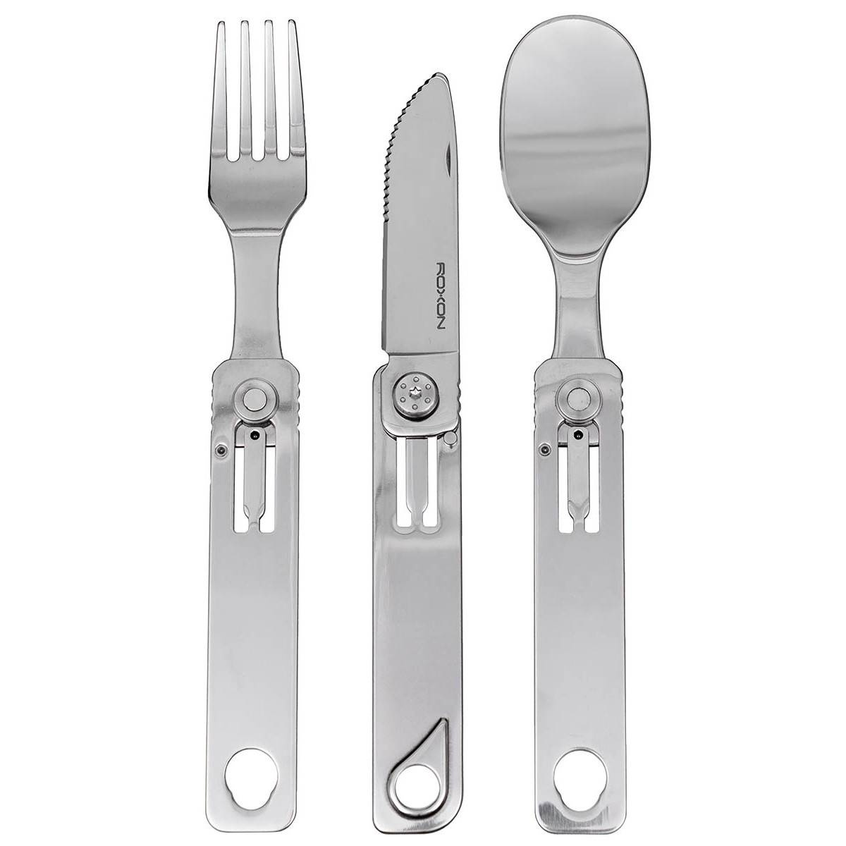 Set de tacâmuri de înaltă calitate de la Roxon®, pliabil, alcătuit din 3 părți, cu lingură, furculiță, cuțit și saculeț pentru transport, ușor și compact, este un accesoriu ideal pentru orice aventură în aer liber.