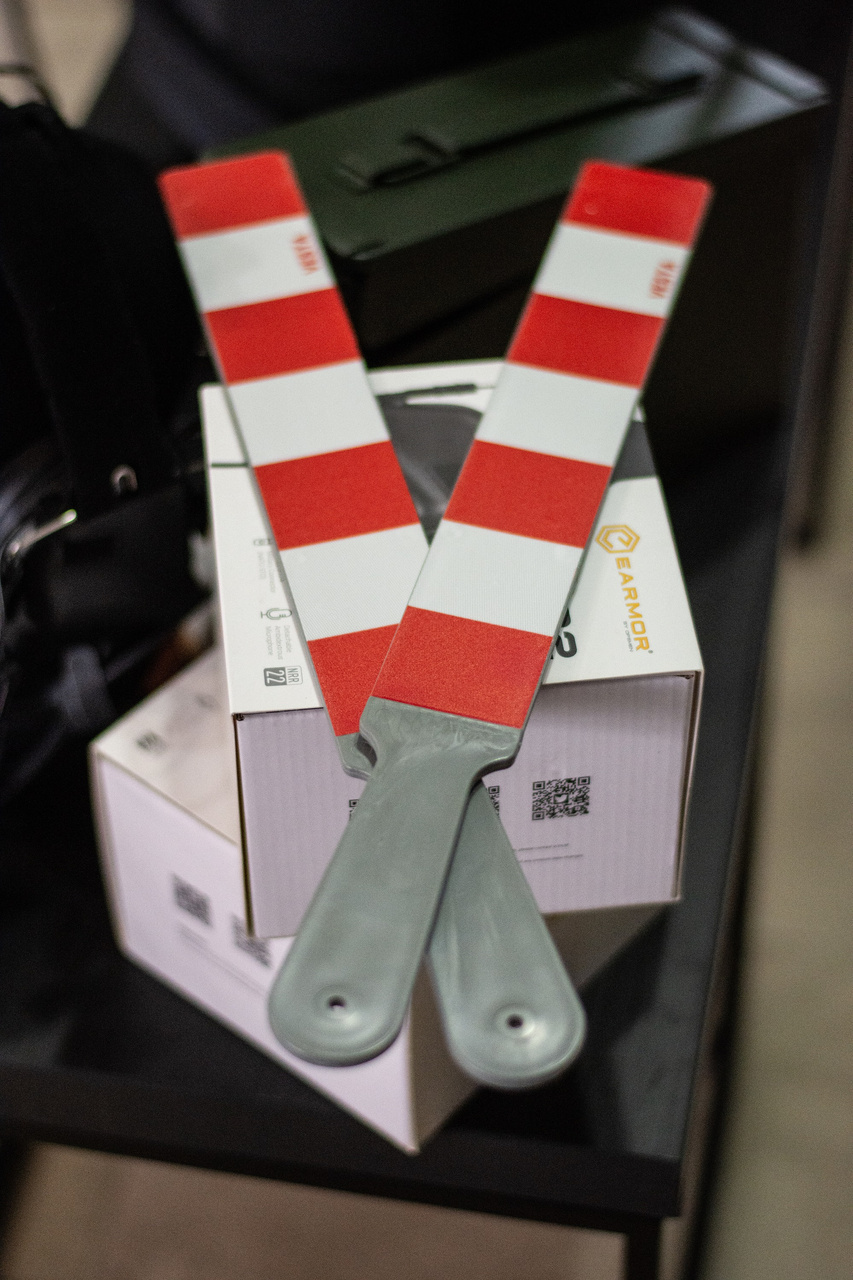 Partea reflectorizanta este realizata din folie reflectorizanta clasa 1, serigrafiata cu dungi albe si rosii, care alterneaza si care sunt dispuse paralel - nu sunt inclinate.