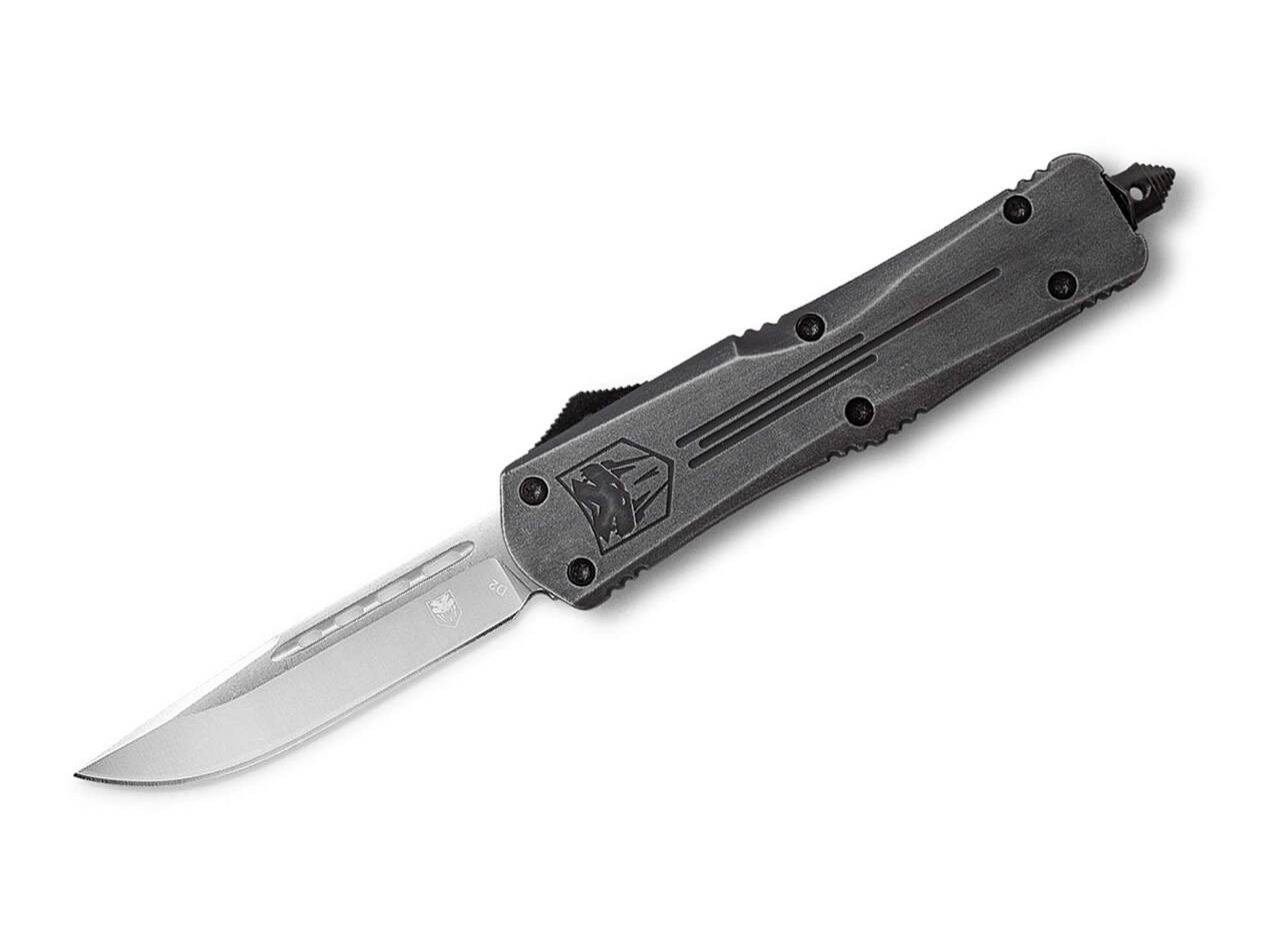 Versiunea completă a popularului FS-3 convinge prin lama solidă de tip drop point din D2, care iese din mânerul frontal la fel de rapid ca o săgeată la apăsarea unui buton și dispare acolo din nou când este apăsat din nou. Cuțitul OTF (Out The Front) prezintă un mâner texturat din aluminiu de înaltă rezistență, care are o finisare rustică stonewash. Clipsul pentru purtare adâncă este atașat la ciocanul pentru spargerea geamurilor și permite purtarea cu vârful în sus pe ambele părți. Furnizat cu o husă de nylon de înaltă calitate.