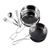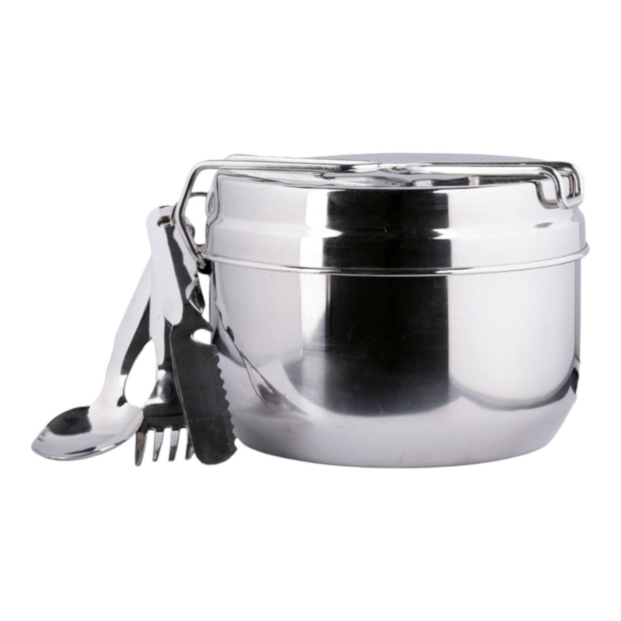 Set vase de camping și bivuac din oțel inoxidabil, compact și funcțional, este format din 2 cratițe și un capac care poate fi folosit ca farfurie, acest vas de bivuac este compact și funcțional, este livrat cu un set de 3 tacâmuri din oțel inoxidabil.
