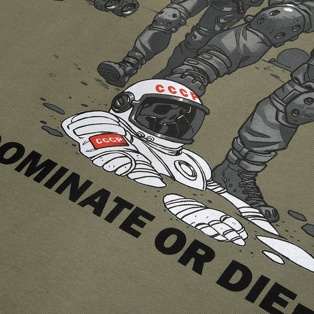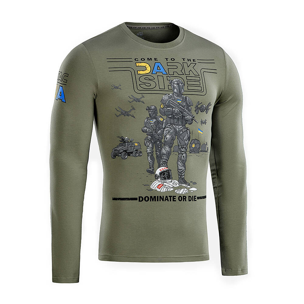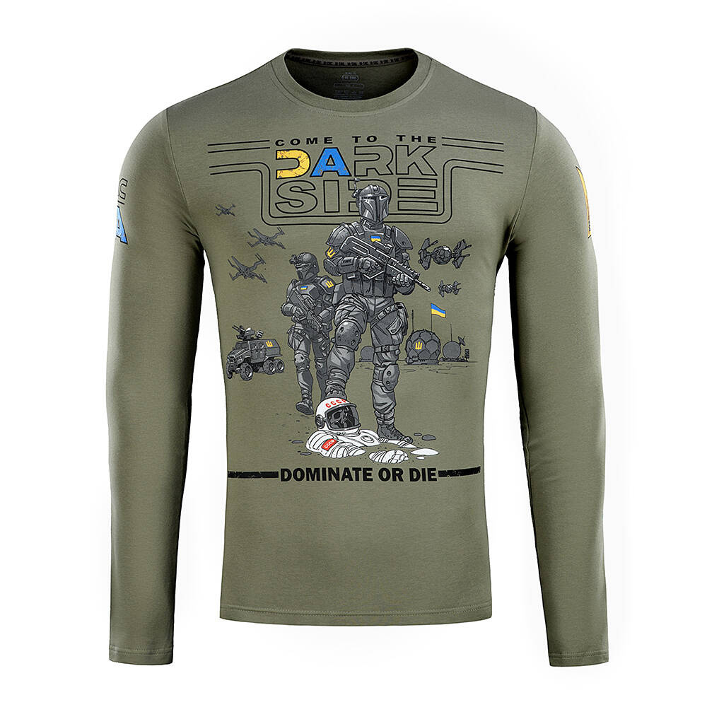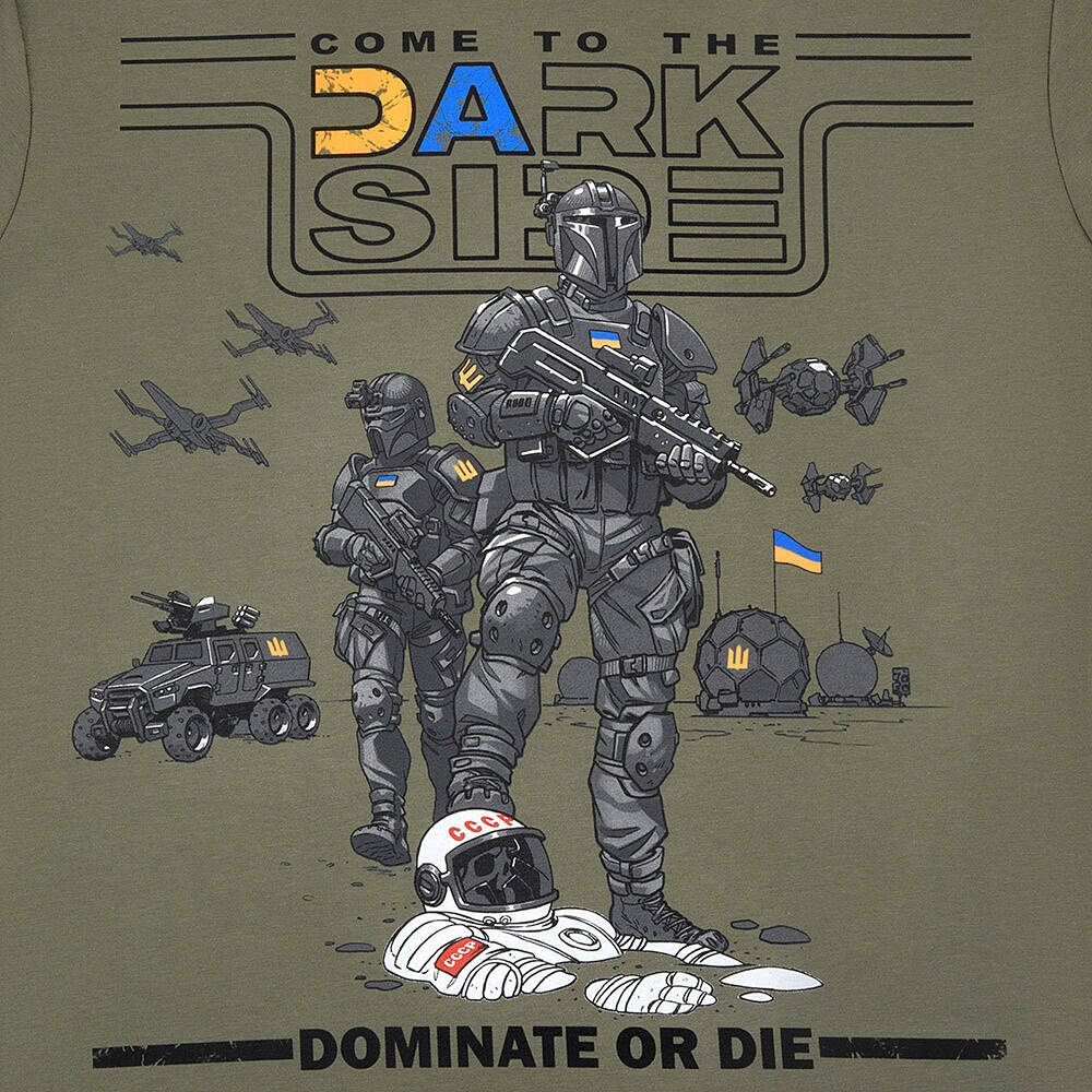 În partea principală a imprimeului de pe piept scrie "Go to the dark side", iar mai jos "Dominate or perish", cu o imagine originală a cosmonauților ucraineni cu puști care stau pe cadavrele dușmanilor sovietici. Mânecile prezintă frumosul logo "M-Tac UA" pe o parte și stema ucraineană cu războinicul "Dark Side" pe cealaltă parte. Tricoul este cel mai potrivit pentru recreere activă și sport, așa că va funcționa bine pentru vânători, pescari, excursioniști și iubitori de diverse sporturi. Elasticul subțire și țesătura tricotată de înaltă calitate evidențiază în mod impresionant atuurile figurii și oferă un sentiment de confort complet.