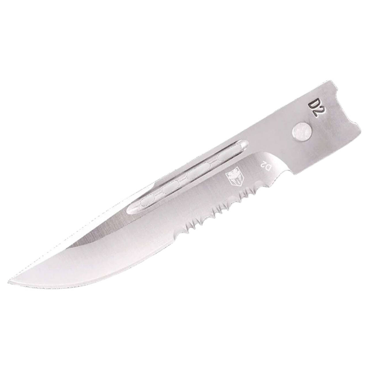 Lamă interschimbabilă realizată din D2 cu tăietură înaltă pentru modelele Cobratec Medium CTK-1. Serrația parțială face lama droppint versatilă.