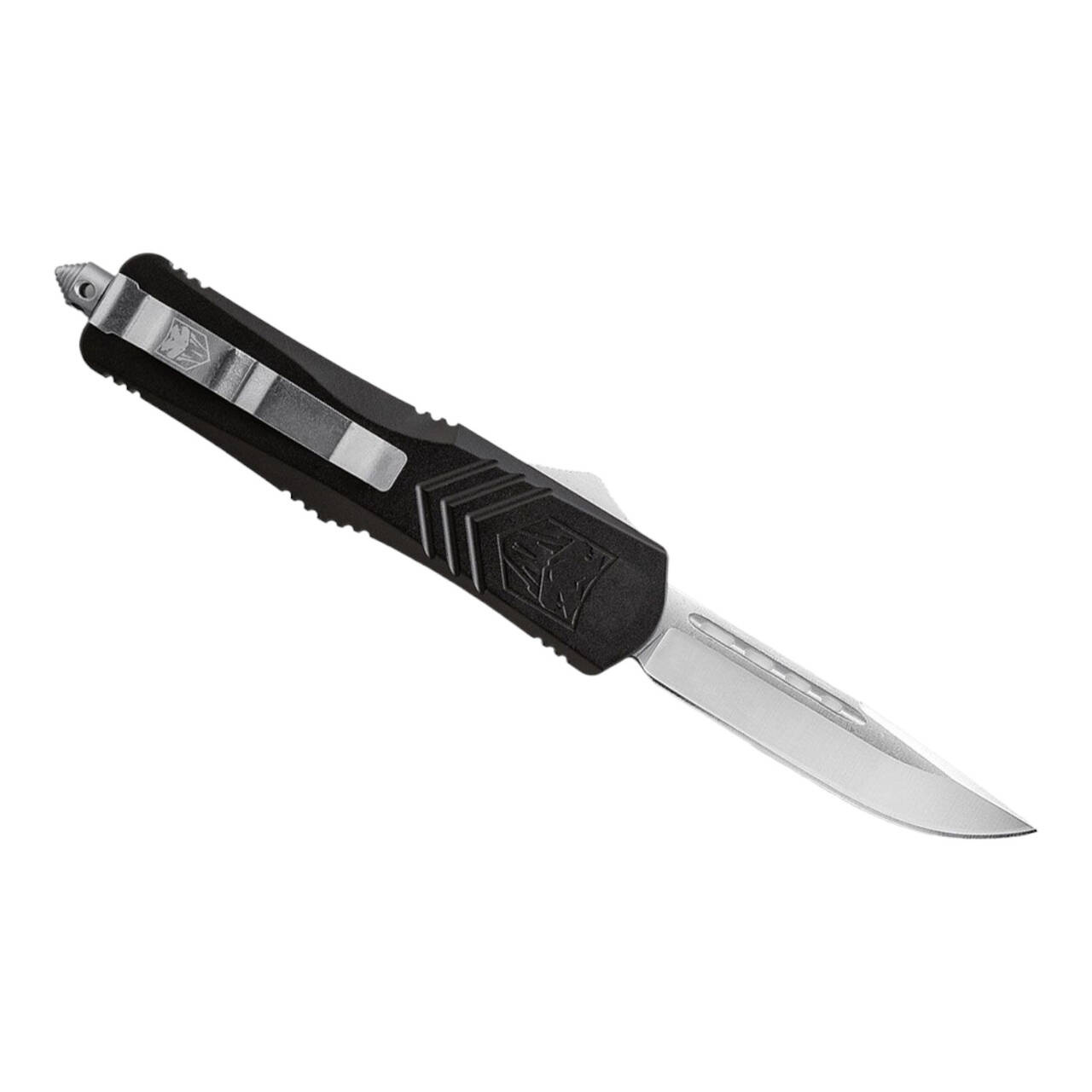 Briceagul compact CobraTec Small FS-X OTF Black convinge cu lama sa din D2 și mânerul antiderapant din aluminiu. Lama iese automat din mânerul frontal (out the front) la apăsarea unui buton. Cu husă din nailon, spărgător de sticlă și clip (tip-down/r).