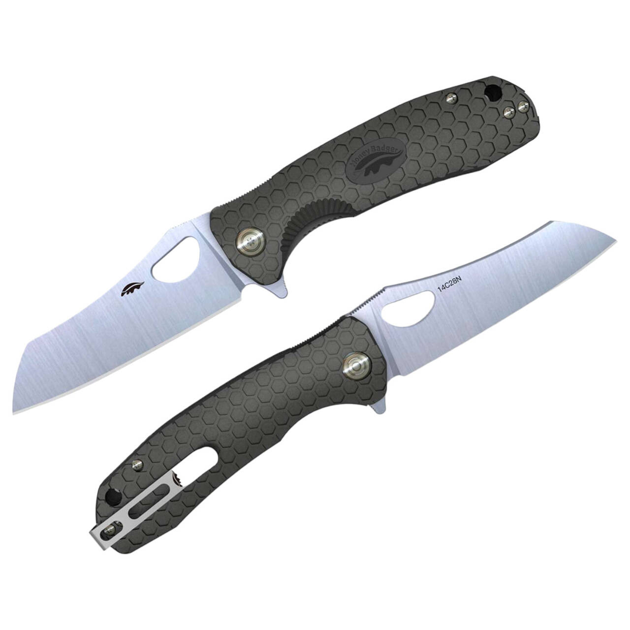 Honey Badger Wharncliffe Medium impresionează în special prin construcția sa robustă. Lama Wharncliffe fabricată din 14C28N este extrem de robustă și ușor de ascuțit. Arborele gros și profilul lat cu o șlefuire complet plată asigură stabilitate și tăiere ușoară. Rulmentul cu bile de înaltă calitate permite deschiderea și închiderea fără probleme a lamei satinate, care poate fi deschisă cu o clapetă sau cu degetul mare. Modelul în formă de fagure de miere al solzilor texturați ai mânerului FRN negru asigură o prindere sigură. Cu orificiu pentru șnur și clemă deep-carry reversibilă (cu vârful în sus).