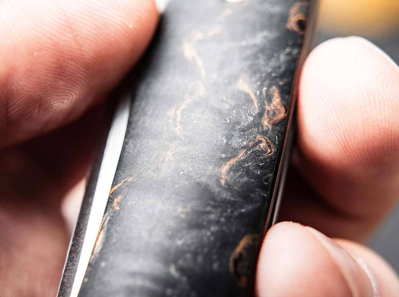 Discret în nume - suveran în aspect. Boker TRPPR (pronunțat: trapper) este un extraordinar cuțit de gentleman care transferă spiritul cu succesului Boker Trapper într-o nouă eră. Deși redus la esențial, cuțitul de buzunar nu lasă nimic de dorit. Lama cu rulmenți cu bile fabricată din metalurgia pulberilor MagnaCut (62-63 HRC) se deschide foarte ușor prin intermediul unui flipper, în timp ce elegantul framelock integral cu inserție din oțel inoxidabil și opritor de cursă asigură cuțitul în mod fiabil. Oțelul folosit pentru lamă se caracterizează în primul rând prin rezistență ridicată la uzură, duritate ridicată și rezistență ridicată la coroziune și este completat de un finisaj atractiv în două tonuri. Bolțul lung al corpului mânerului din titan reinterpretează zeitgeistul nostalgic și modelează TRPPR, cu solzii săi de mâner din mesteacăn stabilizat și granulația sa unică, într-un nou model al culturii contemporane a cuțitelor. Accentele decorative sunt puse de șurubul axului frontal al lamei, care prezintă celebra emblemă Boker în formă de copac, și de clema din titan (tip-up/r) frezată din masiv cu o bilă. Pentru a-l proteja de murdărie și zgârieturi, Boker TRPPR este livrat cu o husă din pâslă de înaltă calitate. Fabricat manual în fabrica Boker din Solingen.