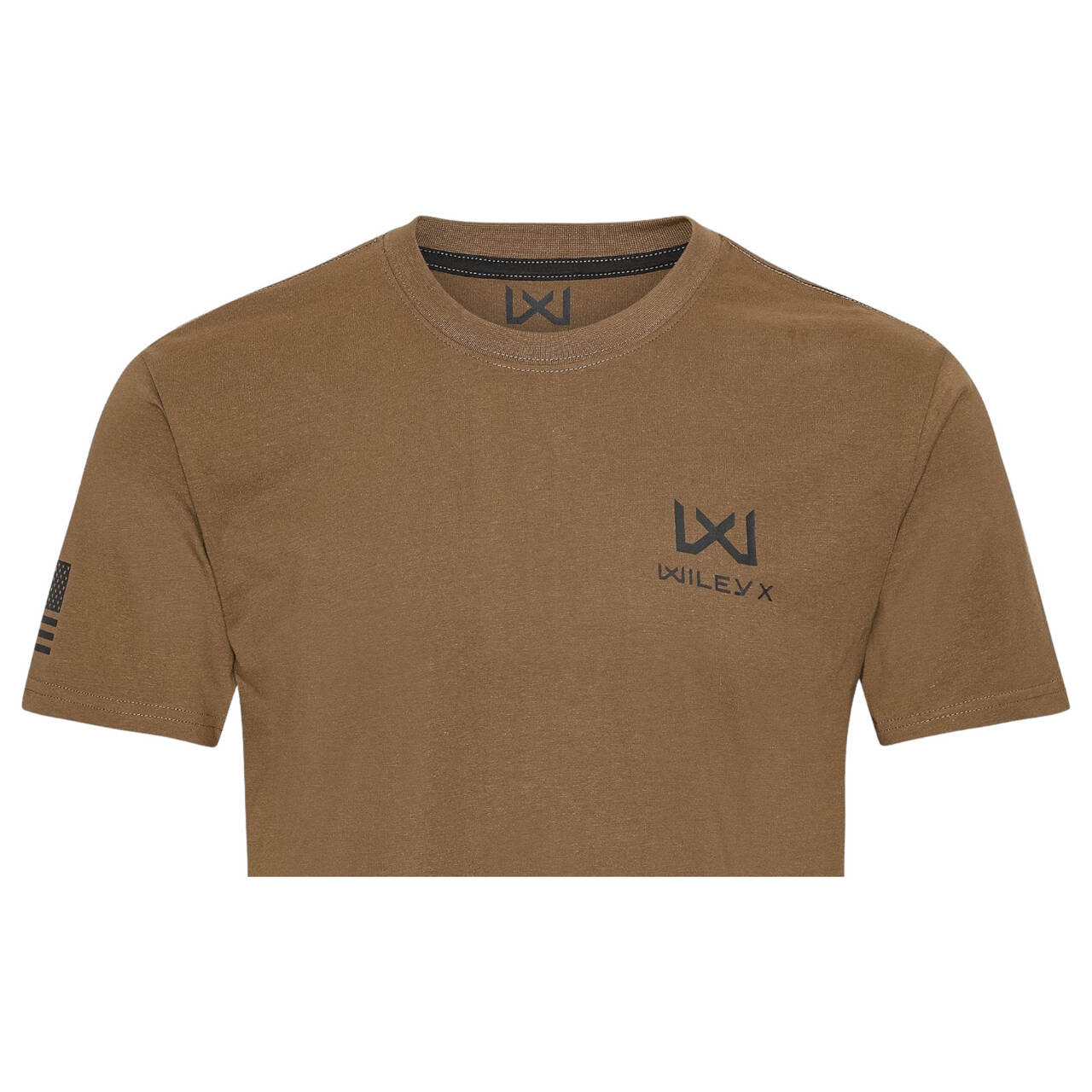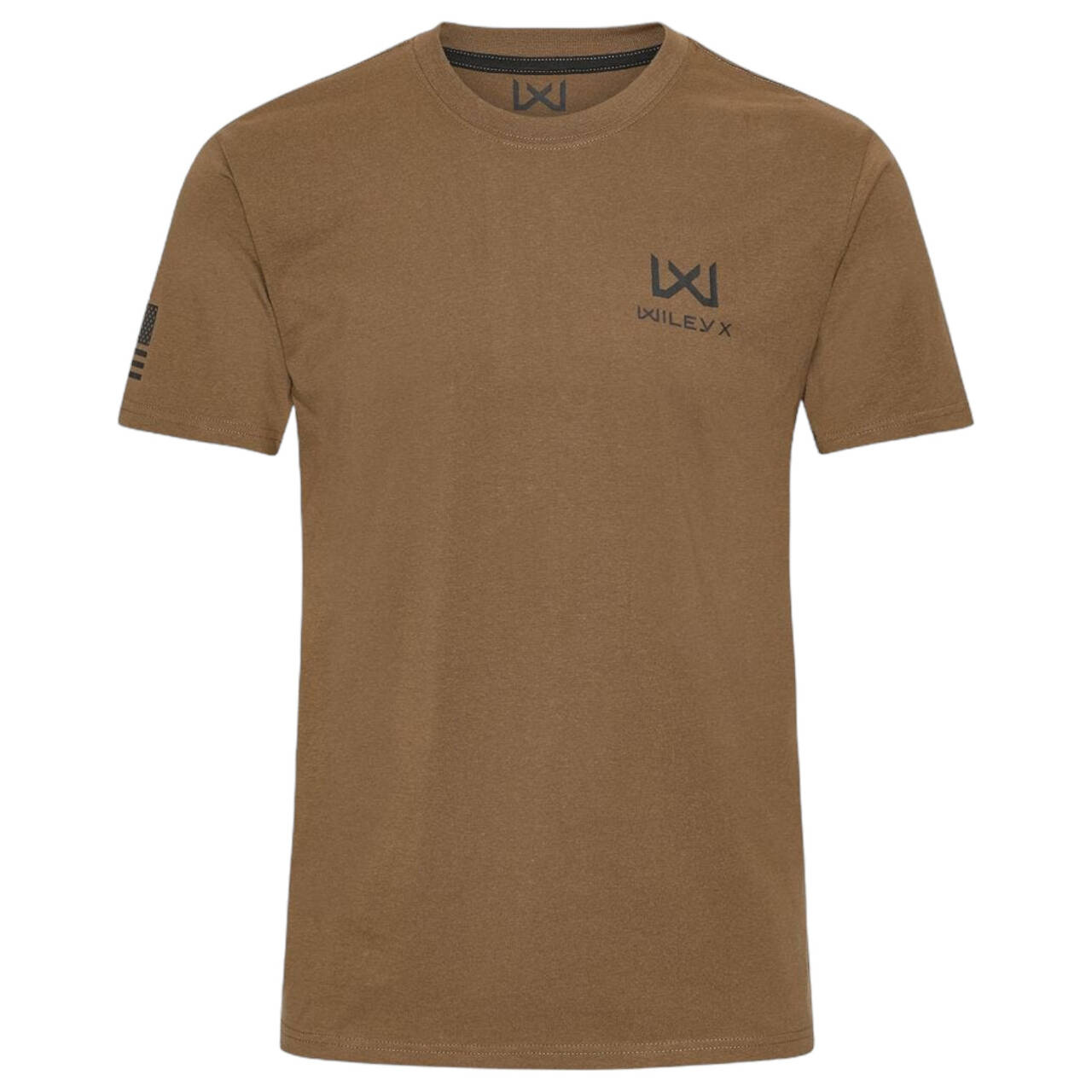 Tricoul este fabricat din 60% bumbac și 40% poliester, ceea ce vă asigură o calitate plăcută, moale, cu confort maximizat. Acesta este imprimat cu un mic logo de contrast WX/Wiley X pe partea stângă a pieptului și o etichetă cu steagul WX la tivul tricoului. Pe mâneca dreaptă, modelul are imprimat un steag de asalt al SUA, ceea ce înseamnă că stelele steagului sunt îndreptate înainte, ilustrând mișcarea steagului, așa cum este cazul pe uniformele americane.