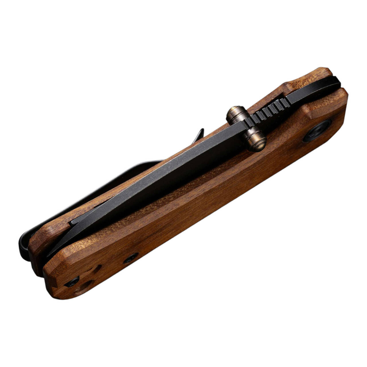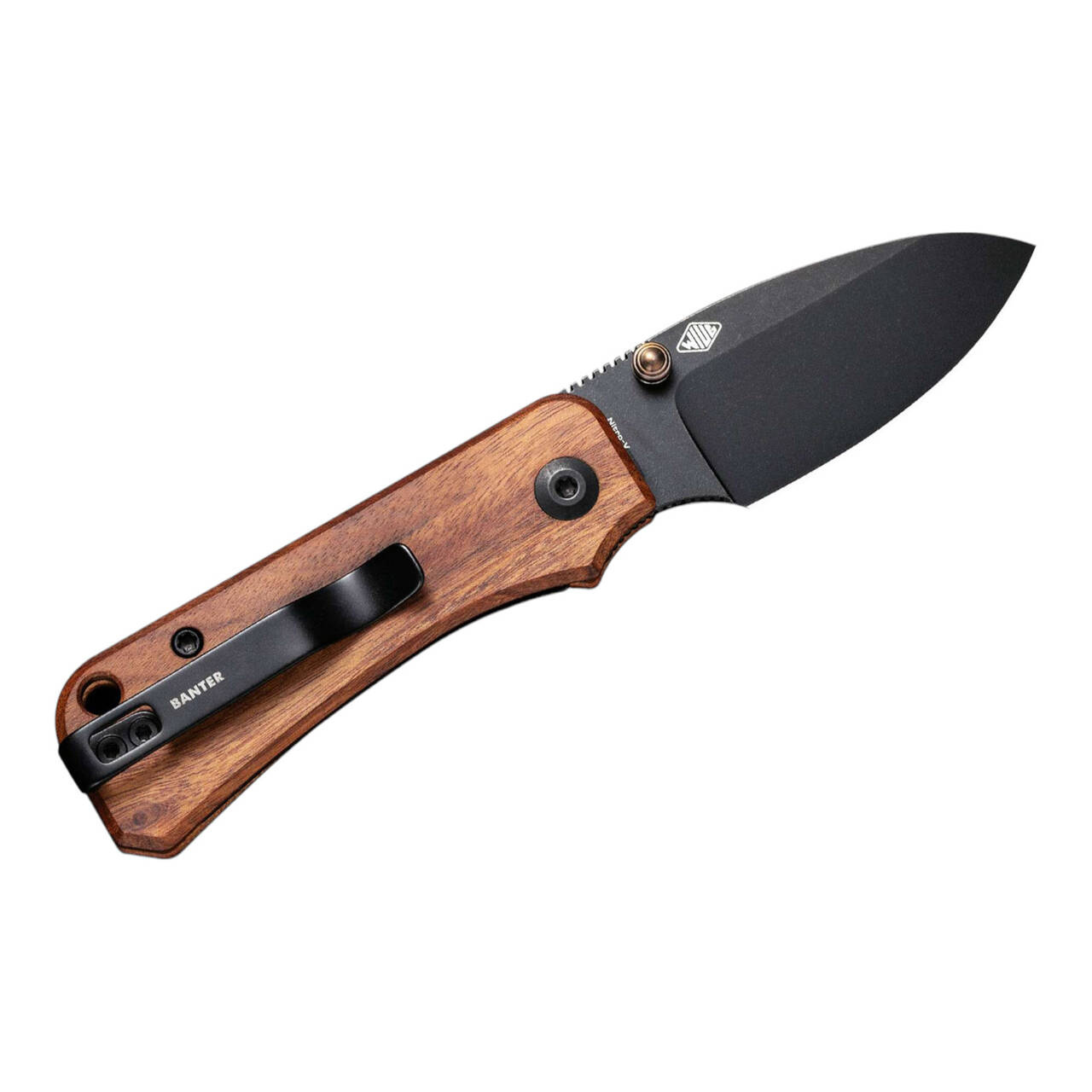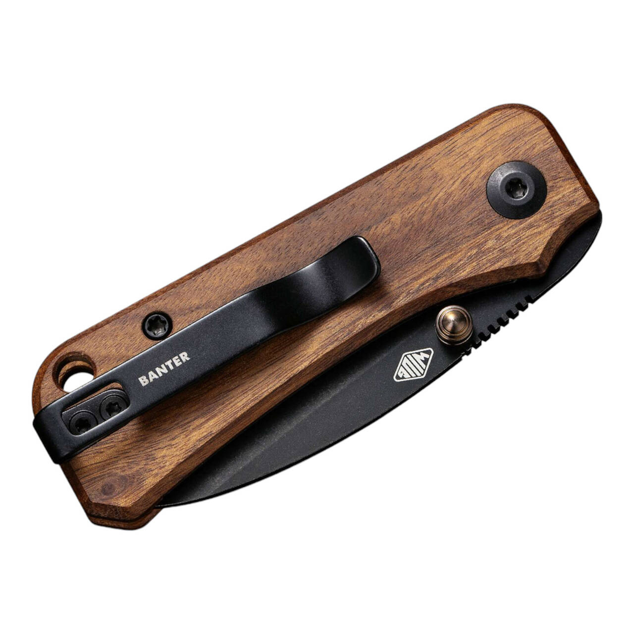 De încredere Baby Banter de la CIVIVI este pregătit pentru orice distracție. În același timp, cuțitul de buzunar proiectat de Ben Peterson nu merge în subsol pentru a râde, ci direct la următoarea aventură în aer liber. Pentru sarcinile zilnice pe care le are la îndemână, lama sa extrem de ascuțită și rezistentă la tăiș, fabricată din metalurgia pulberilor CPM-S-35VN, nu are decât un zâmbet obosit la dispoziție. Este echipată cu un mâner nobil din lemn de cuibourtia, un știft pentru degetul mare și un linerlock. Cu buclă pentru șnur și clip convertibil (tip-up).