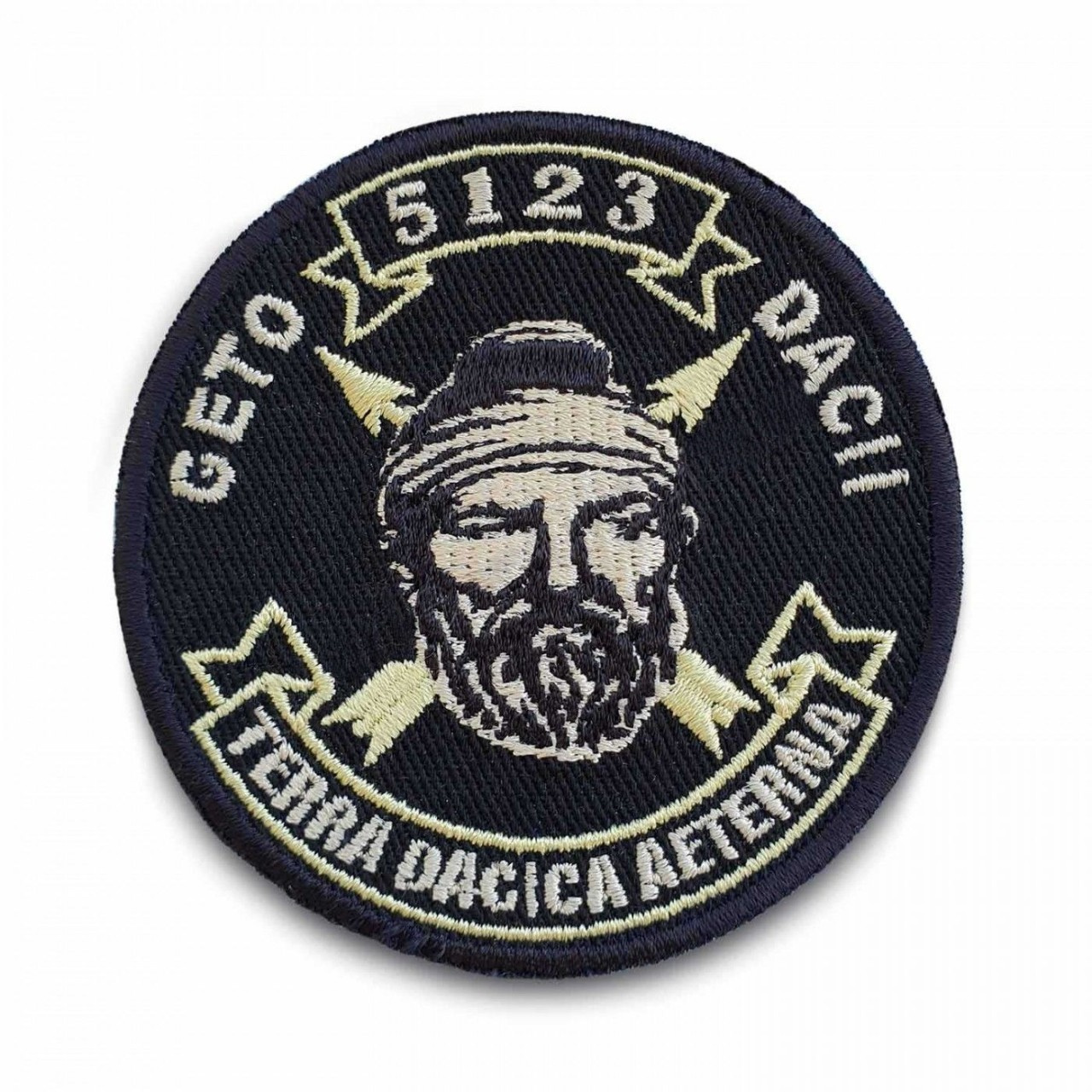 Emblema Geto Dacii - Terra Dacica Aeterna brodata pe suport din tercot termocolat de culoare neagra cu fir Madeira Polyneon.