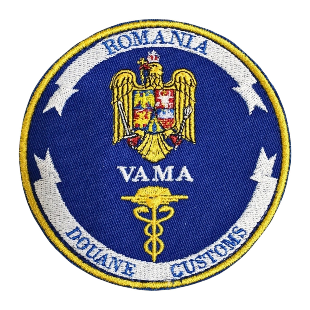 Emblema maneca rotunda Vama brodata se poarta pe maneca uniformei personalului vamal.