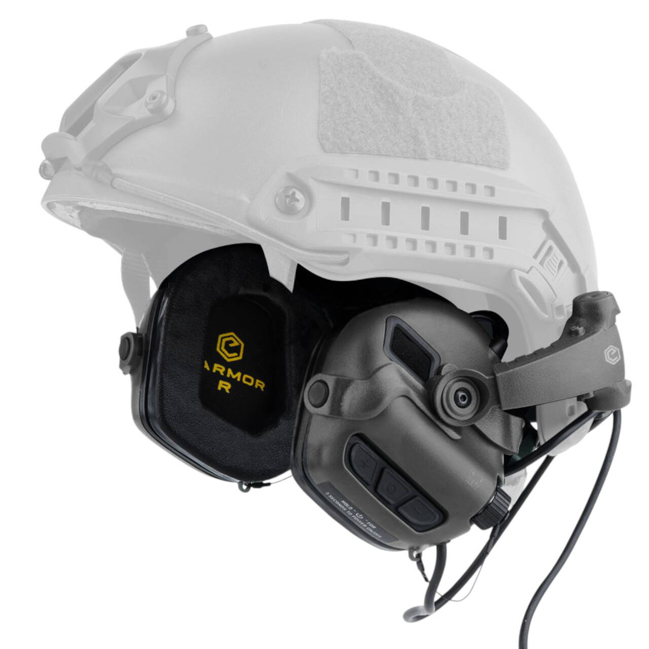Protecții auditive active cu suport pentru cască. Suprimă zgomotele intense fără a opri conversațiile. Intrare audio AUX de 3,5 mm. NRR de 22 dB. Îndeplinește standardele MIL-STD-416 și MIL-STD-810G și gradul de protecție IP67. Culoare: negru.