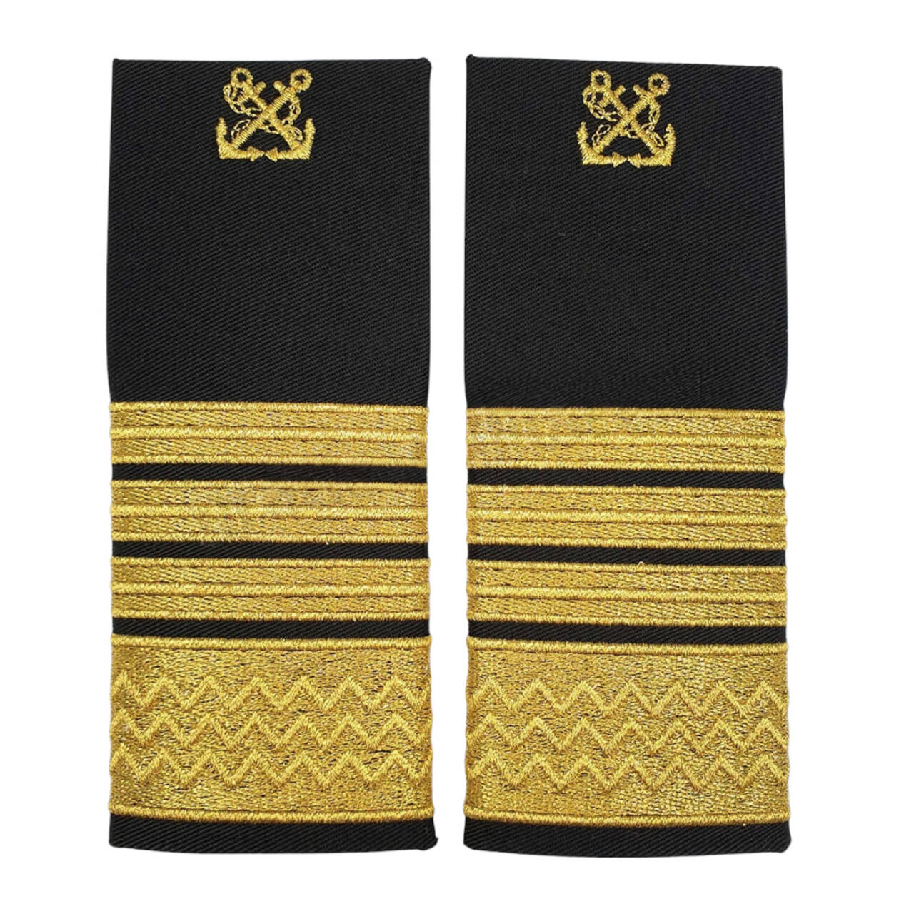 Grade Capitan sef de port ANR brodate cu fir metalic auriu pe un suport confectionat din tesatura cu compozitia 65/35% bumbac/poliester de culoare neagra cu intaritura termocolata. Sunt potrivite pentru sefi servicii/birouri din aparatul central ANR.