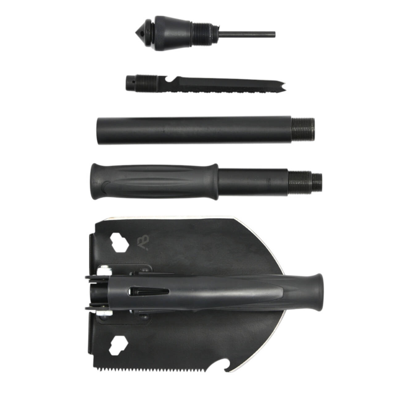 - lamă de lopată cu dinți de ferăstrău pe o parte și lamă de cuțit, poate fi utilizată ca lopată, sapă, ciocan, topor, șurubelniță