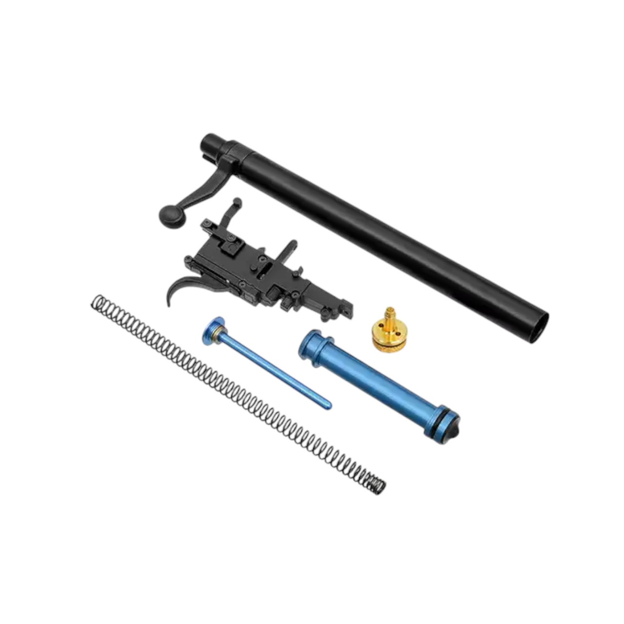 - Unitatea de declanșare are o prindere modificată a pistonului la un unghi de 90 de grade, care îmbunătățește durabilitatea și eficiența atunci când se utilizează arcuri mai puternice. Sistemul hop-up poate fi ușor reglat cu o pârghie pe partea stângă a țevii, permițându-vă să ajustați precizia tragerii.