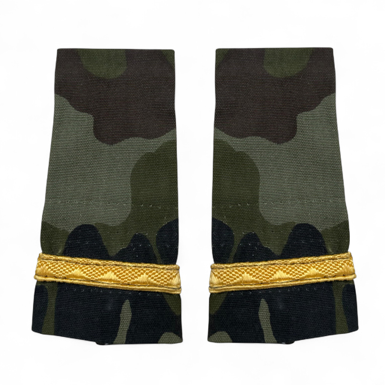 Pereche originală de grade militare românești, utilizate de ofițerii inferiori ai Forțelor Terestre în cadrul uniformei de serviciu sau instrucție. Aceste grade glisante sunt realizate din material textil robust, cu model de camuflaj mozaic tip frunză (M2002)//Camuflaj mozaic Dalmațian, caracteristic Armatei Române post-1990.