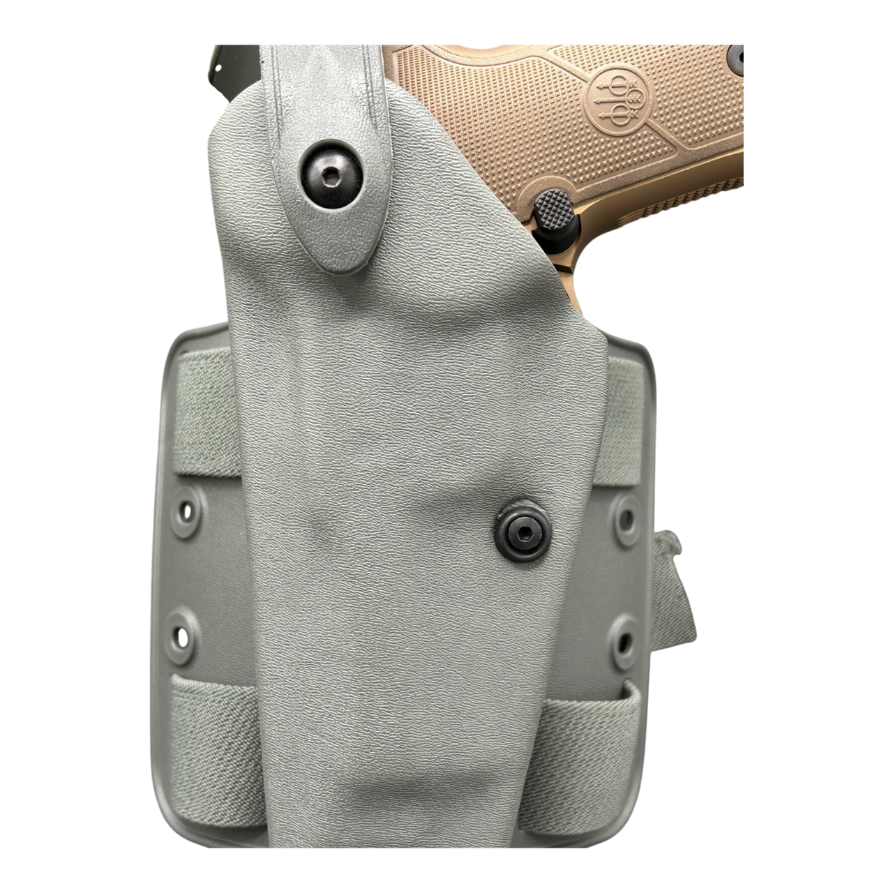 Este echipat cu protecție frontală (capotă din polimer) care limitează accesul neautorizat la armă, crescând protecția împotriva tentativelor de smulgere. Tocul dispune de o cataramă cu eliberare rapidă, permițând prinderea directă pe vestă balistică MOLLE, vestă tactică sau centură de echipament.