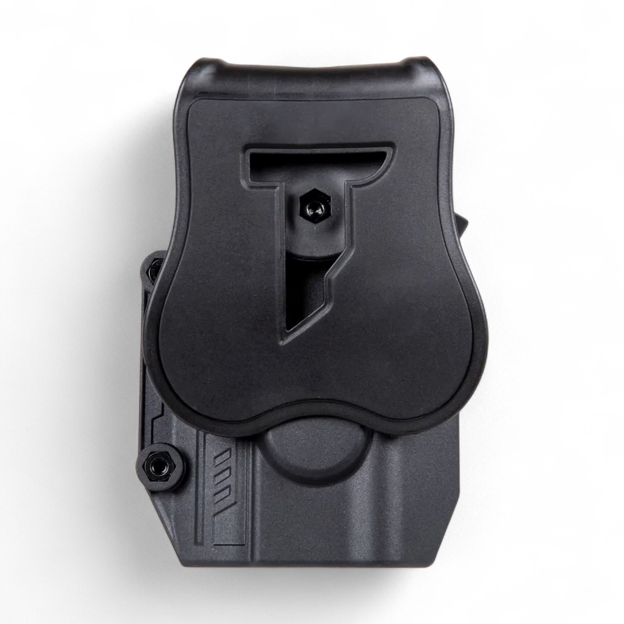 Dispune de un mecanism intuitiv de blocare/deblocare rapidă, acționat cu degetul arătător. Pistolul se blochează automat atunci când este introdus în toc și poate fi eliberat rapid prin apăsarea butonului.