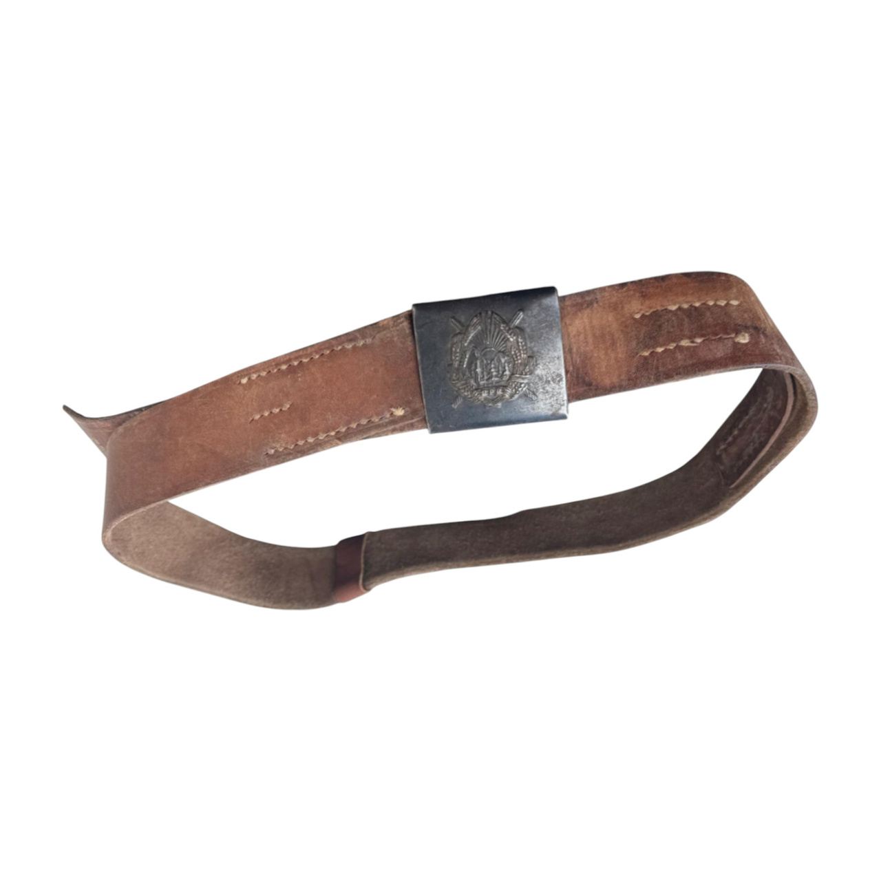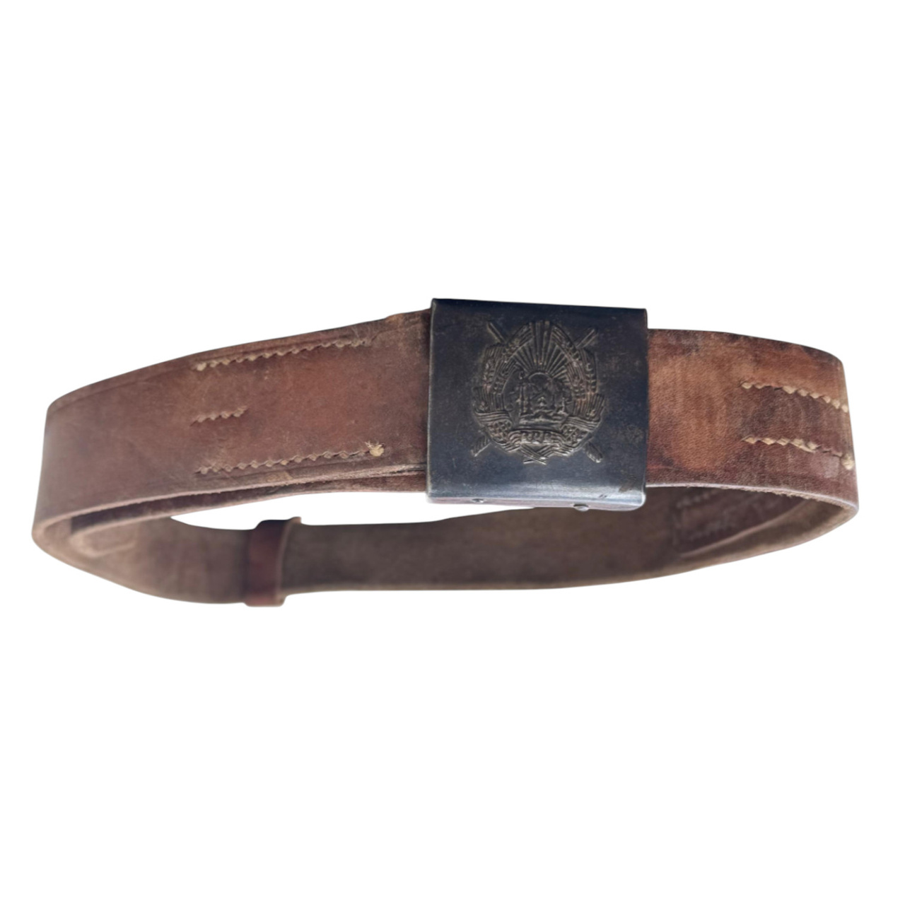 - centura are cataramă (pafta) metalică  de 6 cm cu insemnul oficial al RPR: scutul cu raze de soare, pădurea de brazi, unelte agricole (grâu), și steaua roșie de inspirație sovietică; două săbii încrucișate în fundal - simbolizând componenta militară