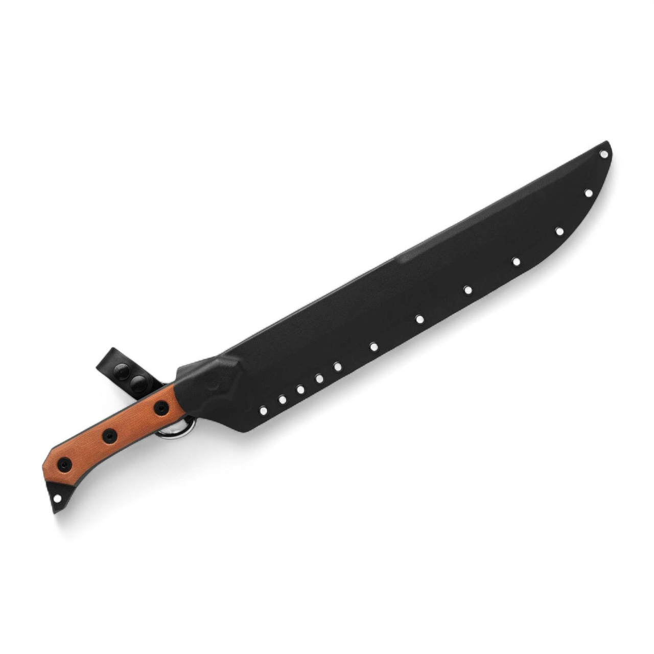 Mânerele din canvas micarta cu două straturi, în combinația de culori negru și maro, sunt fixate pe tangul complet robust cu patru șuruburi hexagonale. Macheta își obține întreaga practicitate datorită unei teci din Kydex, care se potrivește perfect și include un dangler.