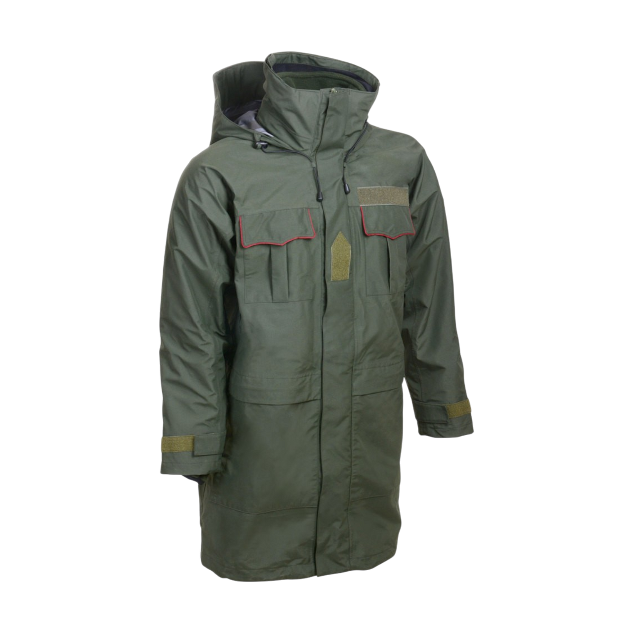 Designul funcțional include glugă integrată, guler înalt pentru protecție sporită a zonei gâtului, buzunare frontale încăpătoare și zone cu benzi Velcro pentru ajustare sau aplicarea de însemne. Croiala este lejeră, permițând libertate de mișcare și posibilitatea purtării peste alte straturi de îmbrăcăminte.