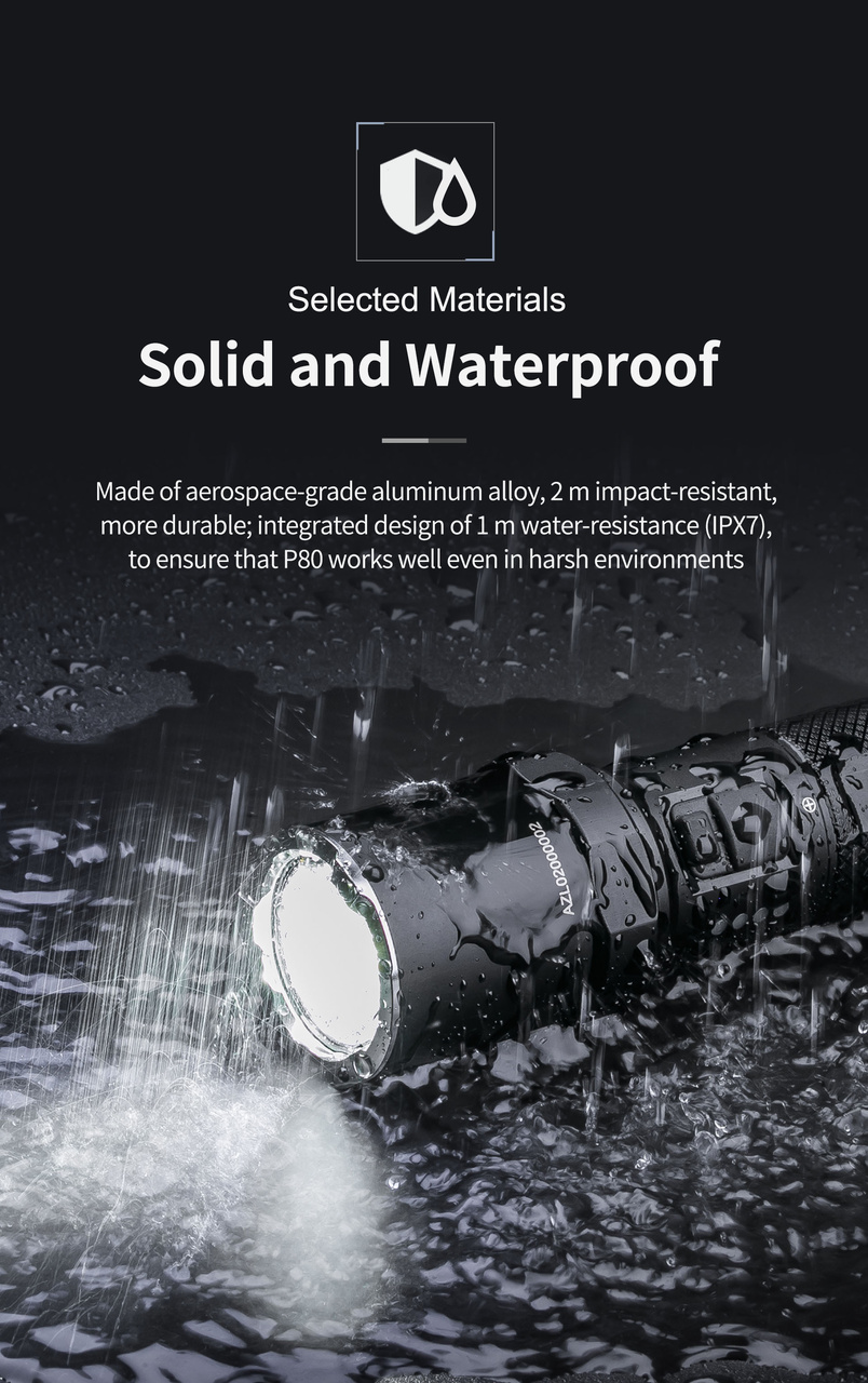 Construcția din aluminiu aerospațial 6061-T6, combinată cu finisajul de anodizare dură tip III, asigură o durabilitate excelentă și rezistență ridicată la uzură. Lanterna este rezistentă la impact de până la 2 metri și complet protejată împotriva apei, cu certificare IPX7.